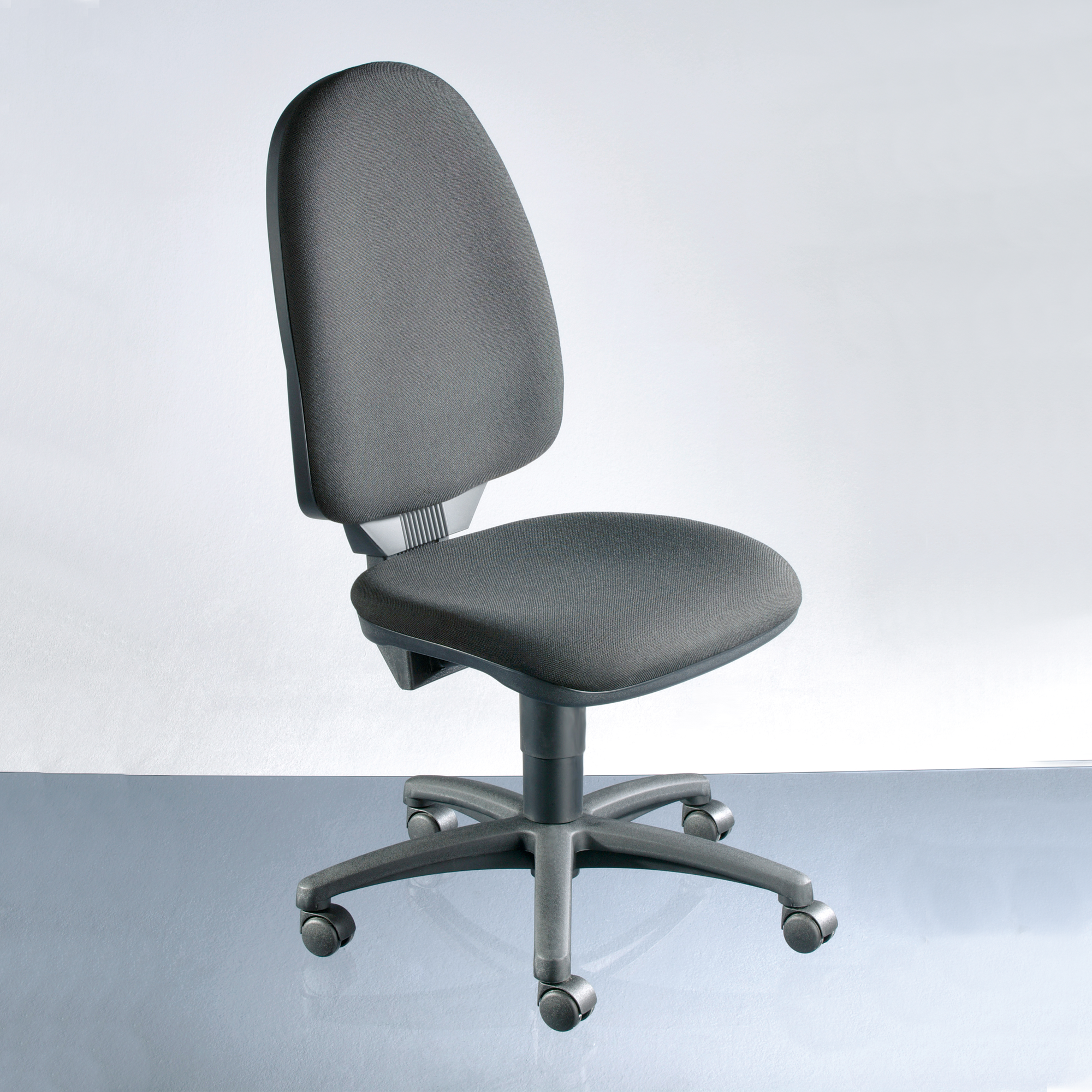 Onze bureaudraaistoel met traploze Toplift zithoogteverstelling staat op een stabiel vijfarmig onderstel op wielen. De ergonomische rugleuning met organische vorm en geïntegreerde lendensteun ondersteunt de gehele rug. Met geïntegreerd comfort-permanent-contactmechanisme voor het verstellen van de hellingshoek van de rugleuning. De rugleuning is traploos in hoogte en helling verstelbaar. Speciaal gevormde zitting met bekkensteun voor maximaal comfort. Mooi gevormd en stabiel kunststof onderstel in zwart met lastafhankelijk geremde dubbele veiligheidswielen.
