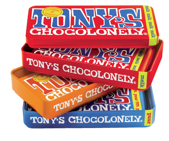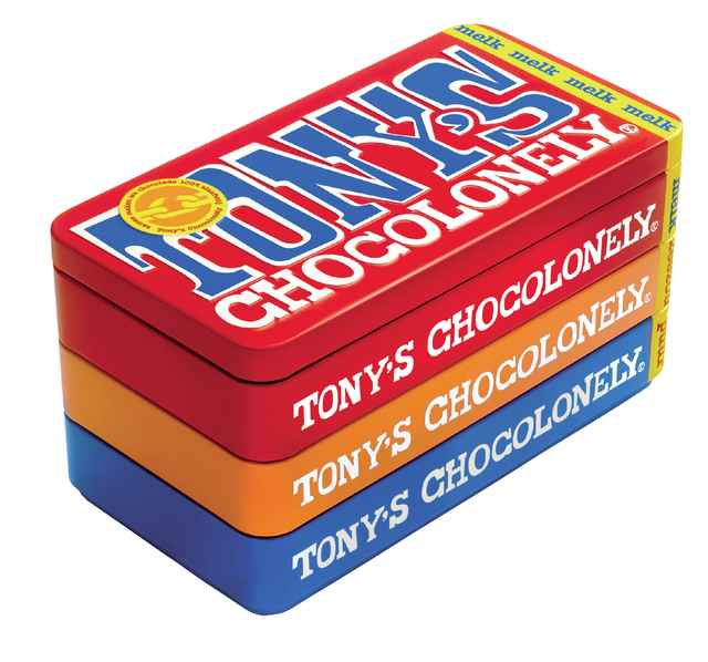 * Tony is gek op chocolade. * Hij wil de allerlekkerste chocolade maken van de beste verse cacao, zonder nare bijsmaak. * Hij ziet cacao niet als commodity van de world stock market. Daarom kopen we onze cacao rechtstreeks in bij de boerencoöperaties in Ghana en Ivoorkust waar we een langetermijnrelatie mee hebben. * Een belangrijke stap richting 100% slaafvrije chocolade. * Verder kopen we onze ingrediënten waar mogelijk Fairtrade-gecertificeerd in en doen we ons best om op alle vlakken een stap vooruit te gaan.* Stapelgek.. op ons stapelblik. *Wat 'n blikvanger! * Drie lagen tjokvol Tony's repen - én 'n mini-boekje met ons verhaal om te delen.