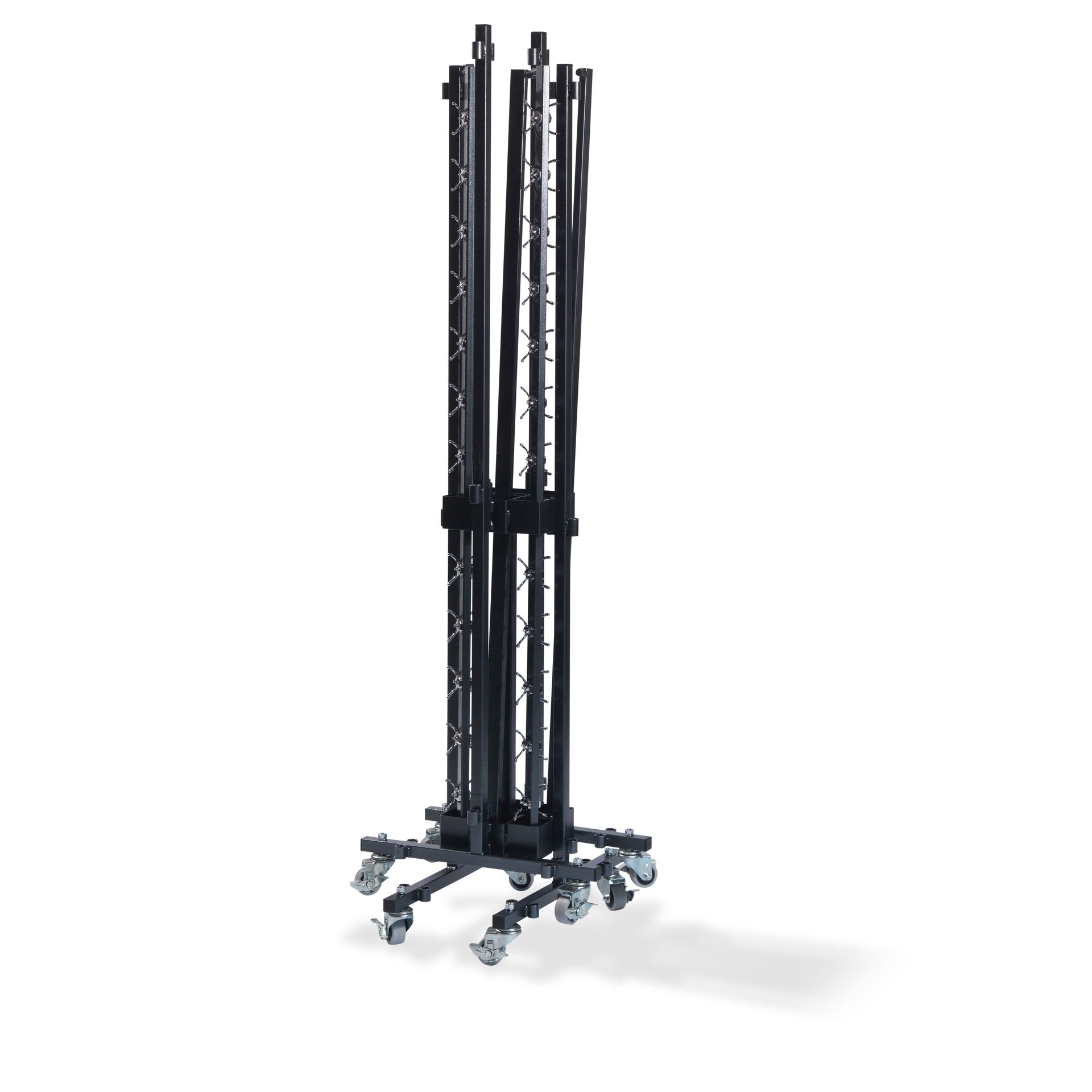 Deze trolley is speciaal ontwikkeld om maximaal twee garderobes in één keer te vervoeren of op te slaan. De garderobes worden in het statief gehangen en zijn vervolgens verrijdbaar op de wielen van de garderobe staanders.
