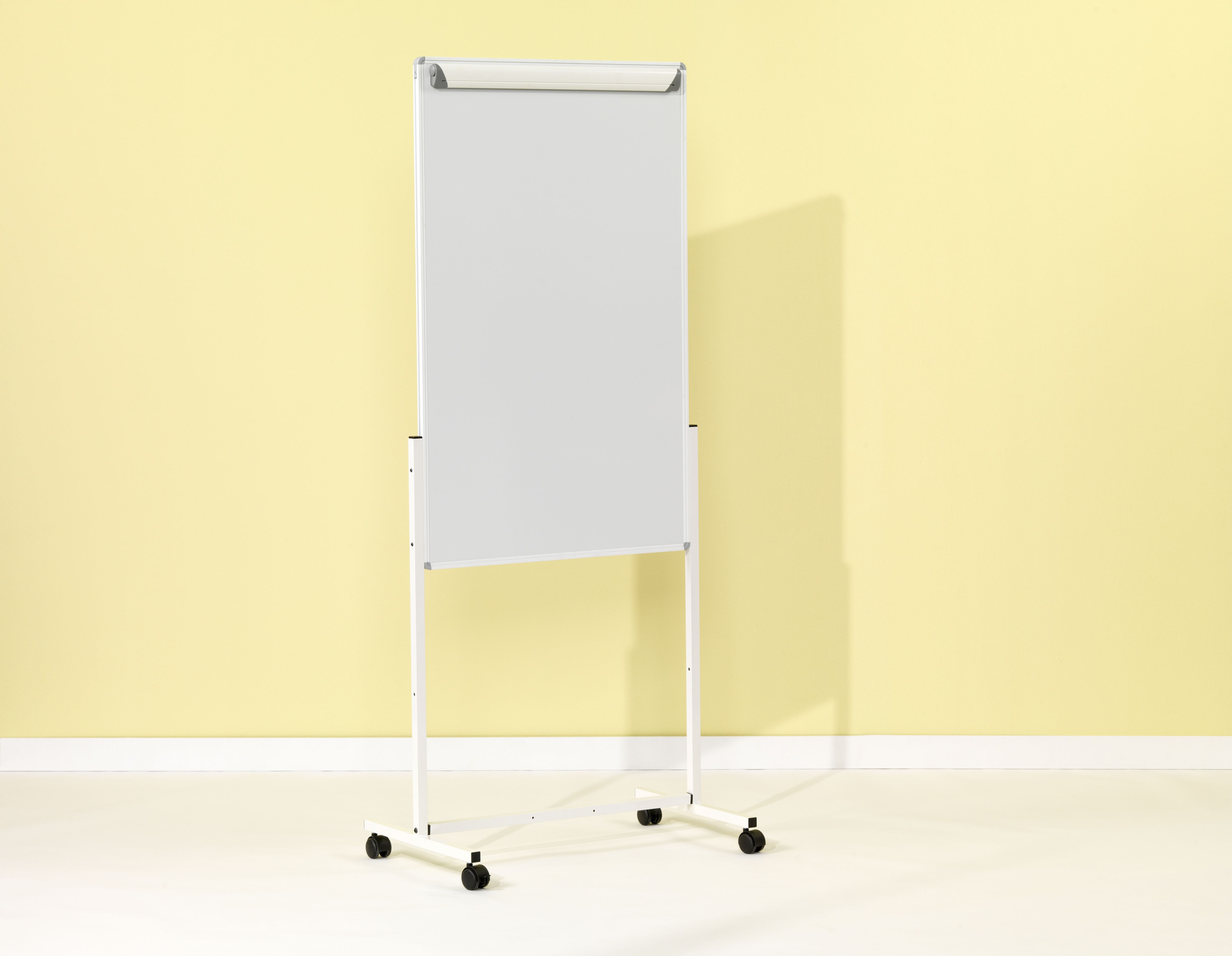 Een 3-in-1 combinatie: één zijde is een wit gelakt whitebord inclusief flip-overklem, de ander zijde een vilt grijs prikbord. Voorzien van 4 wielen (2 met rem) en een stevige stalen constructie met dwarsbalk. Eenvoudig te demonteren