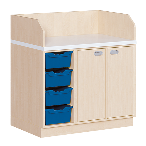 Of het nu gaat om een enkele commode of als een grote commodecombinatie - in ieder geval bieden de verschillende elementen van de commode duurzame materialen, geteste veiligheid, ergonomische afmetingen en veel opbergruimte. Aan drie zijden omringen veiligheidsopstanden het werkblad, dat is voorzien van een waterdichte coating en aan de voorzijde is afgerond voor gebruiksgemak. Dankzij de ingebouwde handgrepen en de verzonken basis kunt u dicht bij de kleedruimte komen. Als uitrusting zijn verschillende varianten van rugvriendelijke klimhulpmiddelen, lades, kinderbadjes en fonteinen verkrijgbaar. Als optie is een bijzonder waterdichte basisvariant verkrijgbaar. U kunt kiezen uit twee verschillende werkdieptes en rechts/links uitvoeringen van de kasten. Het aankleedkussen moet apart besteld worden.
