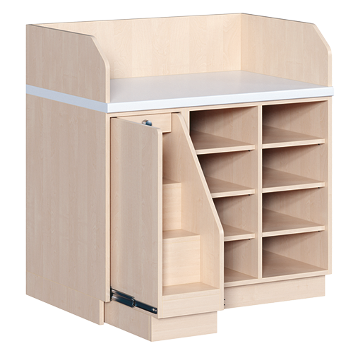 Of het nu gaat om een enkele commode of als een grote commodecombinatie - in ieder geval bieden de verschillende elementen van de commode duurzame materialen, geteste veiligheid, ergonomische afmetingen en veel opbergruimte. Aan drie zijden omringen veiligheidsopstanden het werkblad, dat is voorzien van een waterdichte coating en de voorzijde is afgerond voor gebruiksgemak. Dankzij de ingebouwde handgrepen en de verzonken basis kunt u dicht bij de kleedruimte komen. Als uitrusting zijn verschillende varianten van rugvriendelijke klimhulpmiddelen, lades, kinderbadjes en fonteinen verkrijgbaar. Als optie is een bijzonder waterdichte basisvariant verkrijgbaar. U kunt kiezen uit twee verschillende werkdieptes en rechts/links uitvoeringen van de kasten. Het aankleedkussen moet apart besteld worden.
