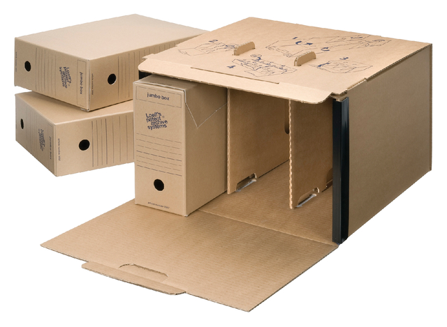 * Jumbo container. * Gemaakt van 40% gerecycled materiaal. * Deze container biedt ruimte aan 3 Loeff boxen, 3 Universeel boxen of 3 Jumbo boxen. * Robuuste constructie, doordacht schakelsysteem en extra verbindingssteunen garanderen een stevige archiefopbouw met ongekend flexibele mogelijkheden. * Rug aan rug koppelbaar en in hoogte en breedte schakelbaar om zo 'straatvorming' te creëren. * Inclusief verbindingssteunen. * FSC-gecertificeerd. * Afmetingen 425x280x400mm.
