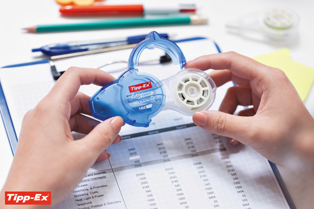 Tipp-ex is een produkt waarmee je type en schrijffouten kunt corrigeren. Deze Duitse fabrikant is in 1959 gestart met de produktie in correctiemiddelen. Het eerste produkt van tipp-ex was een correctiepapiertje met aan 1 zijde een witte stof. Door de foutieve letter nogmaals te typen en dit velletje er dan voor te houden, werd de eerder getypte letter niet meer zichtbaar en kon je de juiste letter ervoor in de plaats typen. In 1965 is de vloeibare versie op de markt gebracht, Net witte verf waar je na het aanbrengen en drogen van de vloeistof weer overheen kunt schrijven of typen. Tegenwoordig zijn het blanco rollers die we inmiddels 't meeste verkopen.