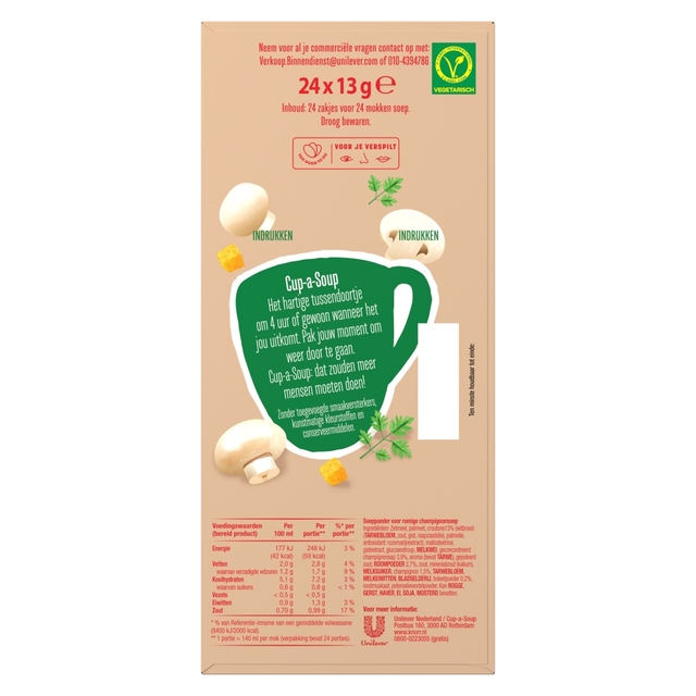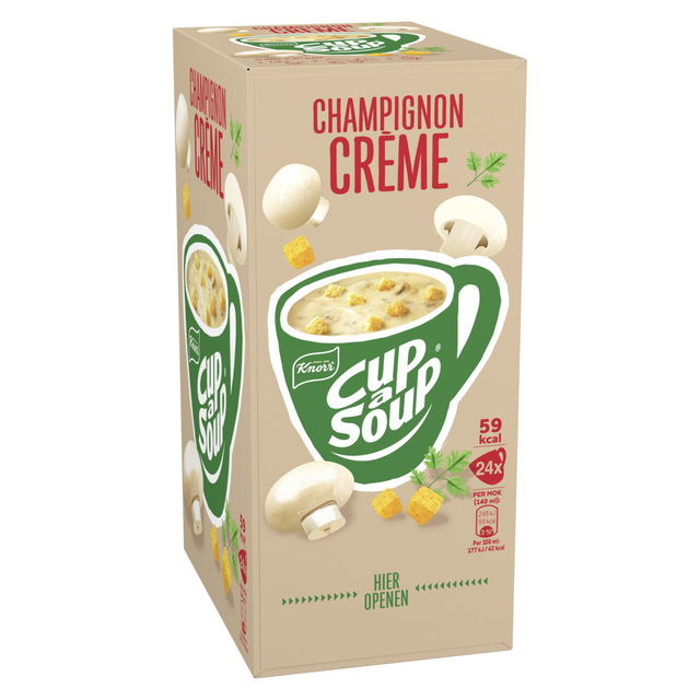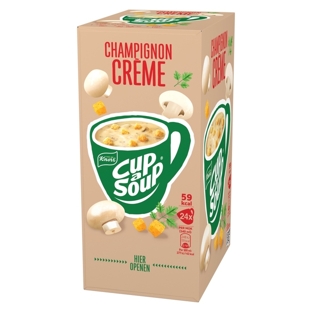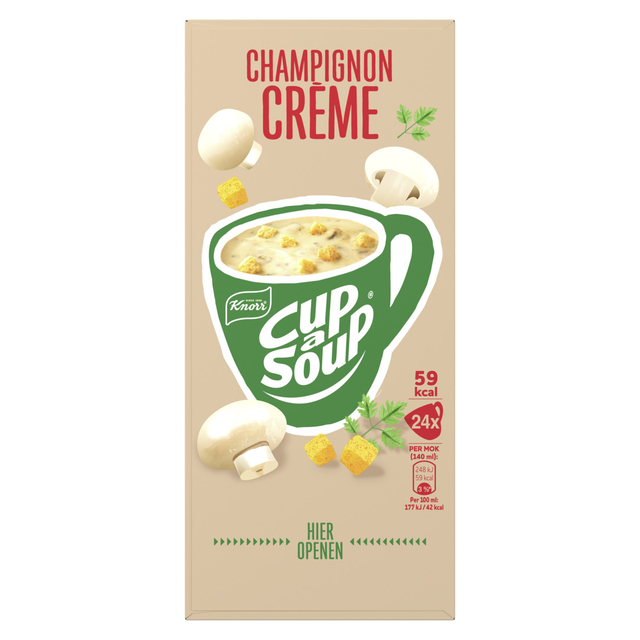 * Heb je zin in een lekker soepje? * Of heb je een drukke dag en zin in een snack om weer scherp en alert door te kunnen? * Dan zit je bij Cup-a-Soup altijd goed! * Zo ook met Cup-a-Soup Champignon Crème: een snelle, hartige opkikker die je weer energie geeft om door te gaan! * Deze is lekker crèmig van smaak en zit vol champignons en knapperige croutons. * In een verpakking Cup-a-Soup Champignon Crème zitten 24 heerlijke zakjes Cup-a-Soup. * Een zakje van deze heerlijke Cup-a-Soup Champignon Crème bevat 59 calorieën per mok. * Zoals je van ons gewend bent, besteden wij veel zorg en aandacht aan ons recept en gebruiken wij alleen de beste ingrediënten om de goede smaak te waarborgen. * Daarnaast bevat deze Cup-a-Soup Champignon Crème geen kunstmatige kleurstoffen, conserveermiddelen of toegevoegde smaakversterkers. * Deze variant is ook geschikt voor vegetariërs. * De Cup-a-Soup Champignon Crème is eenvoudig en snel te bereiden: doe de inhoud van het zakje in jouw favoriete mok en giet er 140 ml kokend water bij. * Daarna eventjes roeren, 1 minuutje wachten en klaar, eet smakelijk! * Zo bereid je binnen een handomdraai een heerlijke mok soep. * Thuis, op kantoor of waar je ook bent, Cup-a-Soup is altijd een heerlijk hartig tussendoortje. * Lekker, makkelijk en snel! 4-uur Cup-a-Soup: BAM! En weer helemaal scherp!