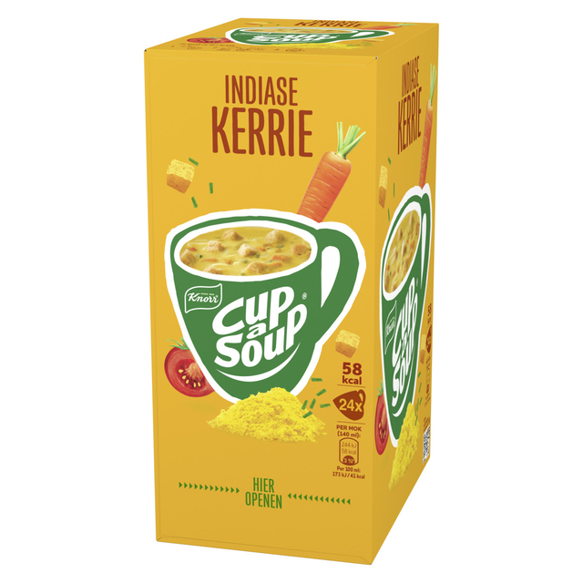 * Heb je zin in een lekker soepje? * Of heb je een drukke dag en zin in een snack om weer scherp en alert door te kunnen? * Dan zit je bij Cup-a-Soup altijd goed! * Zo ook met Cup-a-Soup Indiase Kerrie: een snelle, hartige opkikker die je weer energie geeft om door te gaan! * Vol kruidige kerrie, maar ook met stukjes wortel, tomaat en knapperige croutons voor een nog vollere smaak. * In een verpakking Cup-a-Soup Indiase Kerrie zitten 24 heerlijke zakjes Cup-a-Soup. * Een zakje van deze heerlijke Cup-a-Soup Indiase Kerrie bevat 72 calorieën per mok. * Zoals je van ons gewend bent, besteden wij veel zorg en aandacht aan ons recept en gebruiken wij alleen de beste ingrediënten om de goede smaak te waarborgen. * Daarnaast bevat deze Cup-a-Soup Indiase Kerrie geen kunstmatige kleurstoffen, conserveermiddelen of toegevoegde smaakversterkers. * De Cup-a-Soup Indiase Kerrie is eenvoudig en snel te bereiden: doe de inhoud van het zakje in jouw favoriete mok en giet er 140 ml kokend water bij. * Daarna eventjes roeren, 1 minuutje wachten en klaar, eet smakelijk! * Zo bereid je binnen een handomdraai een heerlijke mok soep. * Thuis, op kantoor of waar je ook bent, Cup-a-Soup is altijd een heerlijk hartig tussendoortje. * Lekker, makkelijk en snel! 4-uur Cup-a-Soup: BAM! En weer helemaal scherp!
