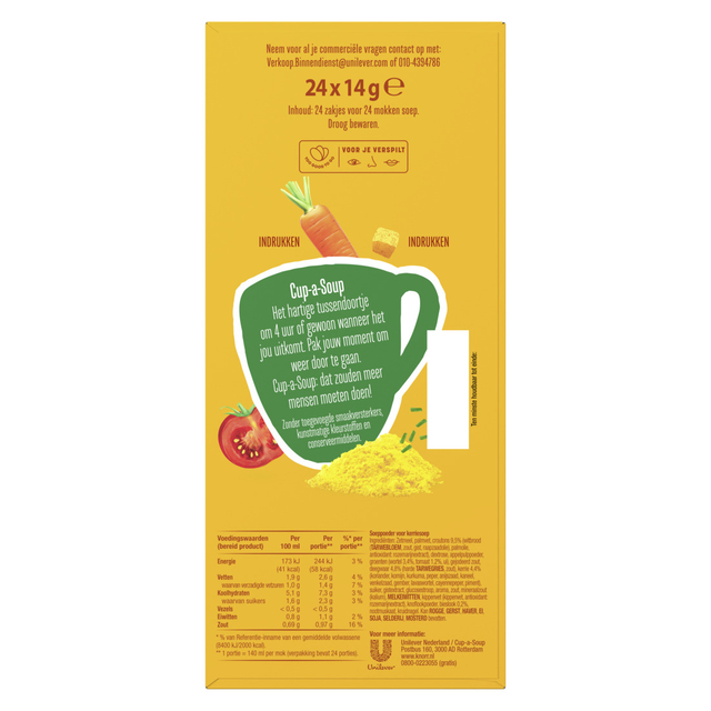 * Heb je zin in een lekker soepje? * Of heb je een drukke dag en zin in een snack om weer scherp en alert door te kunnen? * Dan zit je bij Cup-a-Soup altijd goed! * Zo ook met Cup-a-Soup Groente: een snelle, hartige opkikker die je weer energie geeft om door te gaan! * Een goed gevulde groentesoep met smaakvolle rode paprika, ui, wortel, erwt, knolselderij, prei en knapperige croutons. In een verpakking Cup-a-Soup Groente zitten 24 heerlijke zakjes Cup-a-Soup. * Een zakje van deze heerlijke Cup-a-Soup Groente bevat 60 calorieën per mok. * Zoals je van ons gewend bent, besteden wij veel zorg en aandacht aan ons recept en gebruiken wij alleen de beste ingrediënten om de goede smaak te waarborgen. * Daarnaast bevat deze Cup-a-Soup Groente geen kunstmatige kleurstoffen, conserveermiddelen of toegevoegde smaakversterkers. * Deze variant is ook geschikt voor vegetariërs en veganisten. * De Cup-a-Soup Groente is eenvoudig en snel te bereiden: doe de inhoud van het zakje in jouw favoriete mok en giet er 140 ml kokend water bij. * Daarna eventjes roeren, 1 minuutje wachten en klaar, eet smakelijk! * Zo bereid je binnen een handomdraai een heerlijke mok soep. * Thuis, op kantoor of waar je ook bent, Cup-a-Soup is altijd een heerlijk hartig tussendoortje. * Lekker, makkelijk en snel! 4-uur Cup-a-Soup: BAM! En weer helemaal scherp!