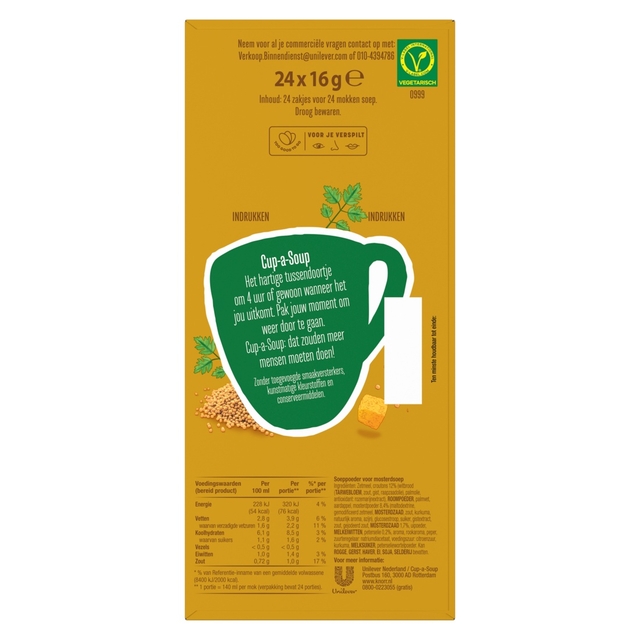 * Cup-a-Soup Mosterd: een snelle, hartige opkikker die je weer energie geeft om door te gaan! Dit is een heerlijke volle en krachtige soep, met een milde mosterdsmaak.