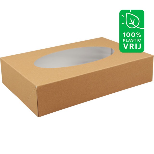 De handzame cateringdozen zijn gemaakt van voedselveilige FSC-gecertificeerd kraft en kan naderhand bij het oud papier. De stapelbare dozen zijn voorzien van een ovaal kijkvenster zodat de aantrekkelijke inhoud mooi zichtbaar is. Geschikte doos voor het vervoeren en presenteren van broodjes gebak en taart voor gourmet- barbecue- en visschotels en voor mooi opgemaakte schalen met salades.