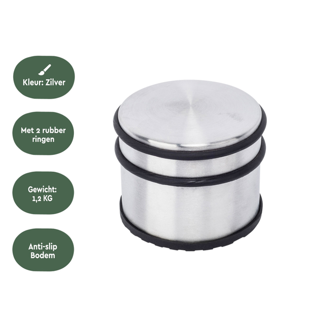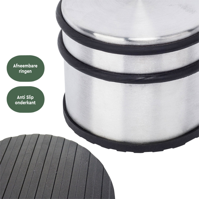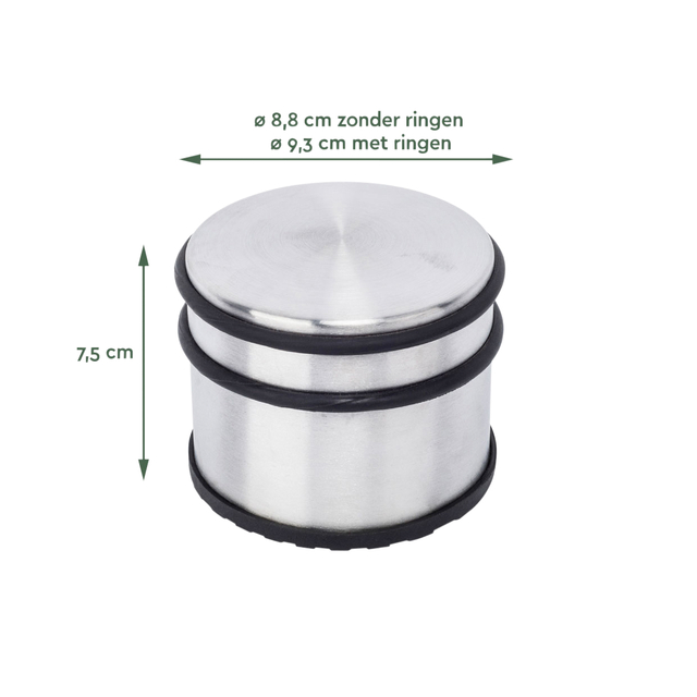 * Nooit meer dichtvallende of klapperende deuren. Geen beschadigingen, butsen of krassen meer aan meubels, plinten, deurbeslag of muren. Met deze robuuste deurstopper, of deurbuffer, van BRASQ ben je verzekerd van een kwalitatieve deurstopper die diverse type deuren (hout/staal) open of tegenhoudt. * Plaats de deurstopper direct voor of achter een deur, luik of raam en voorkom dichtwaaien of dichtslaan. De deurstopper is voorzien van rubberen ringen aan de bovenkant die er voor zorgen dat er geen beschadigingen ontstaan aan deuren, muren of meubels. Aan de onderzijde van de deurstopper zit een rubberen afwerking, wat zorg voor een praktische anti-slip functie. * Met slechts een gewicht van 1,2 kg verplaats je de vloer deurstopper eenvoudig naar de gewenste plaats in huis of kantoor. Zowel de BRASQ Deurstopper in RVS of zwart gekleurde uitvoering past perfect in het elk type interieur. * Afmeting product: ⌀9,3 x H:7,5 cm * Gewicht product: 1,1 KG * Materiaal: Staal * Afwerking: Geborsteld RVS met rubber ringen en onderzijde.