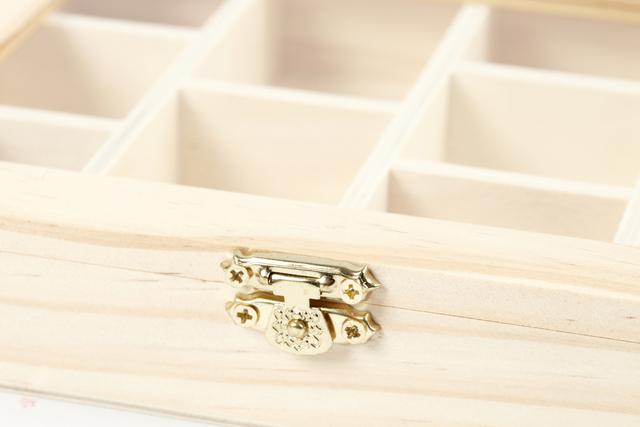 Houten doos met glazen deksel en metalen sluiting verdeeld in 10 vakken in 2 maten. Ideaal voor decoratie met acrylverf, porseleinstiften, mozaïek en nog veel meer! Afmetingen:15,5x20,5x3,5 cm.