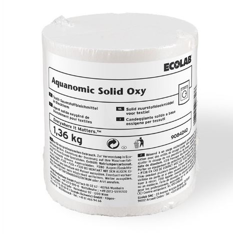 Aquanomic Solid Oxy bleekmiddel; voor het verwijderen van vlekken in wasgoed. Een geconcentreerd zuurstofbleekmiddel en ontvlekker voor textiel in een solide vorm. Het behoudt witheid en de sterkte van het wasgoed.