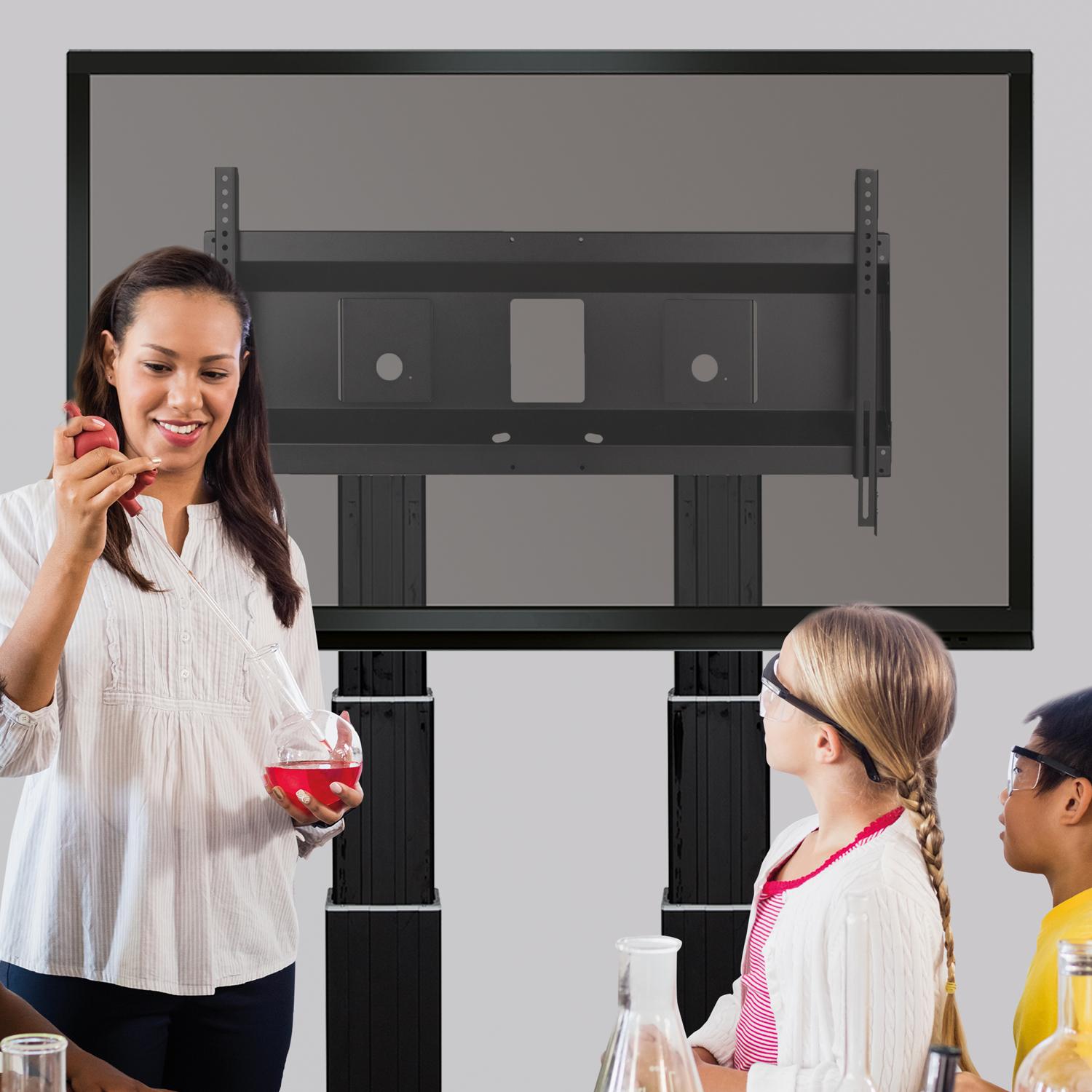 Elektrisch in hoogte verstelbare TV standaard; monitor muurbeugel met XL-beeldschermbeugel. Speciaal ontwikkeld voor montage van zware touchscreens. De gemotoriseerde, in hoogte verstelbare monitor muurbeugel is voorzien van een extra breed frame. Het systeem wordt geleverd met twee driedelige Conen Mounts mastkolommen en is 70 cm in hoogte verstelbaar. Het product is verdeeld in 3 pakketten. Elk van de pakketten is geschikt voor koeriersdiensten.