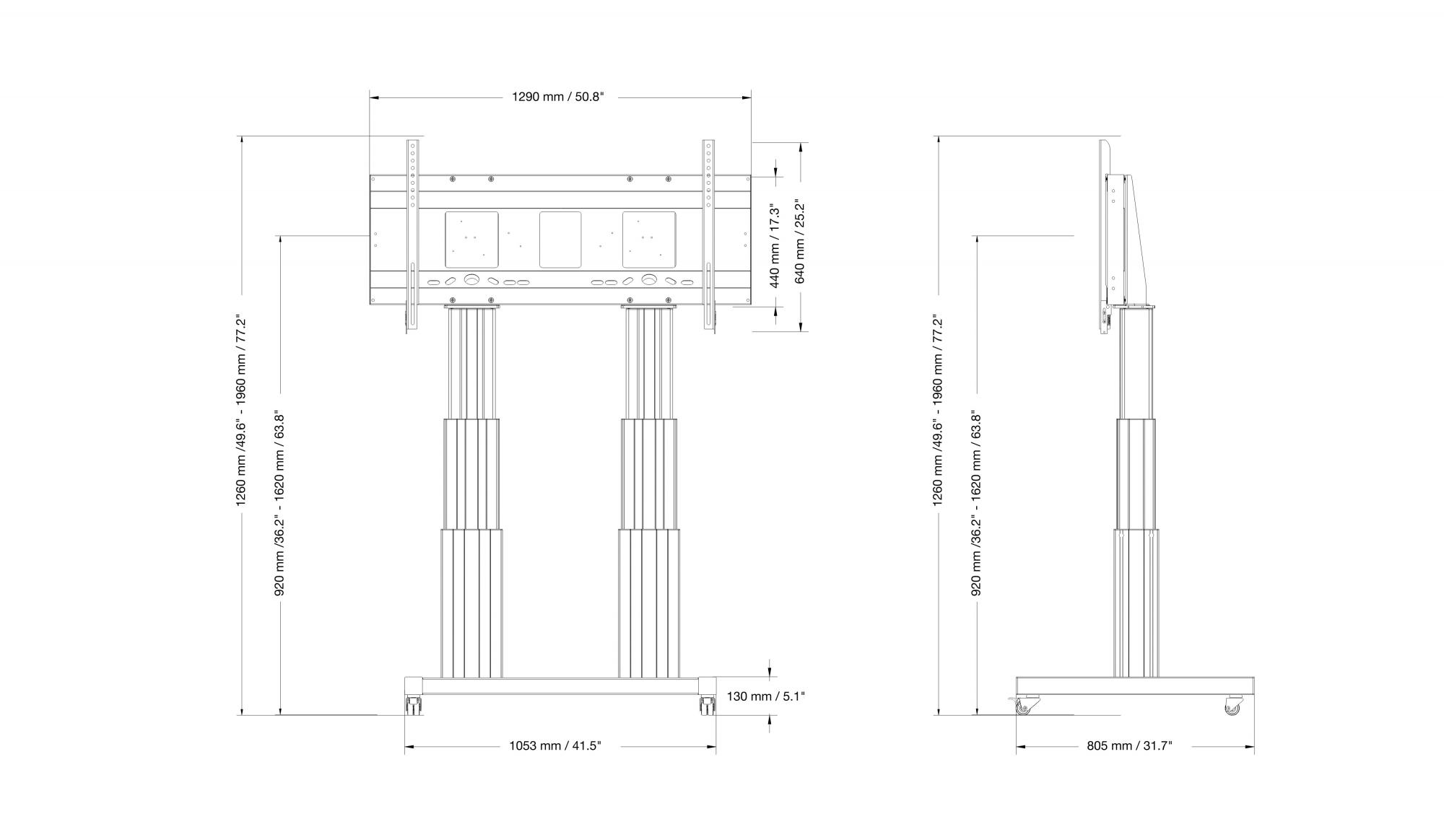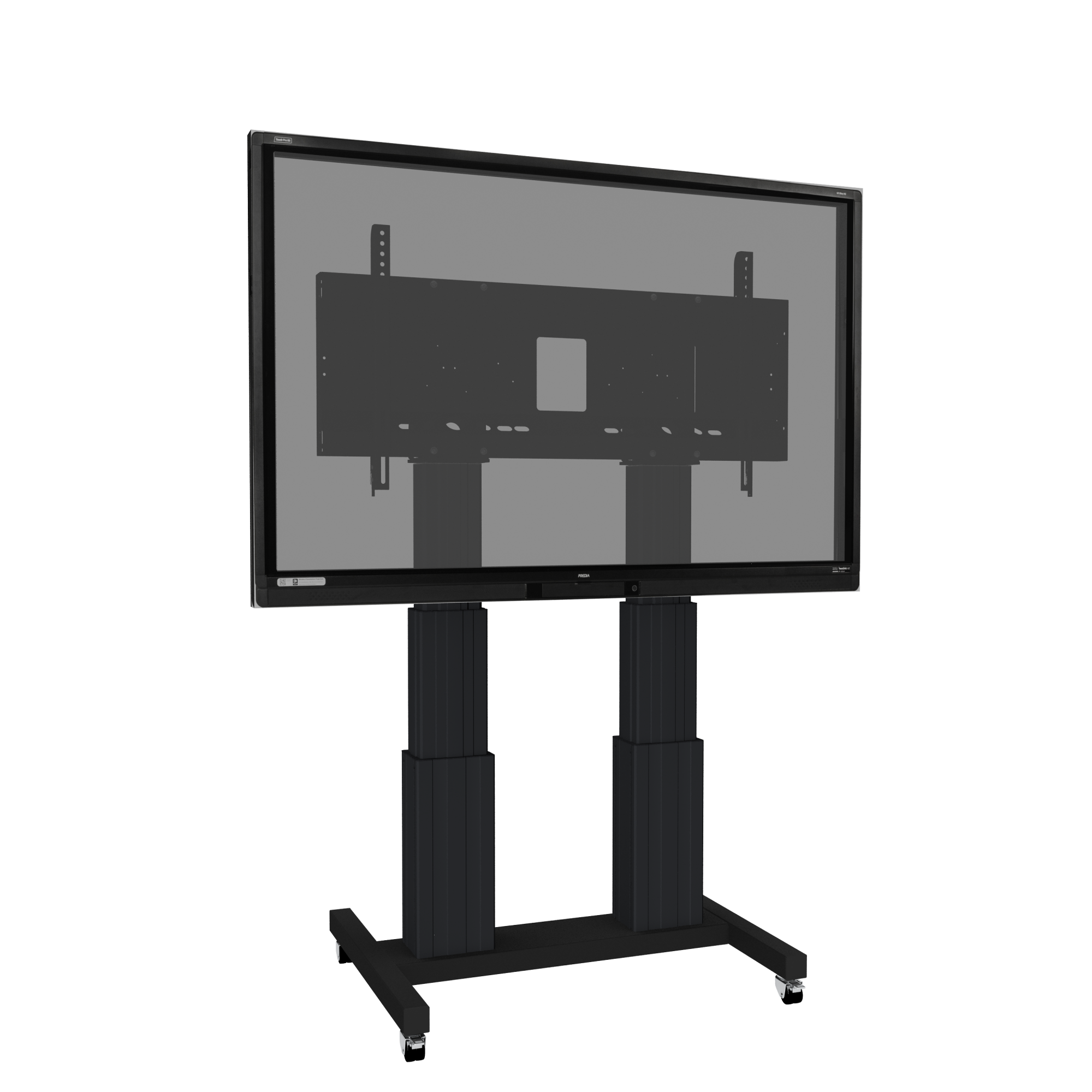 Elektrisch in hoogte verstelbare tv-trolley met XL-frame voor het plaatsen van displays. De tv-trolley is ontwikkeld voor gebruik met interactieve touchscreen flatscreens. De elektrisch in hoogte verstelbare trolley wordt geleverd met een extra brede displayhouder. De mobiele monitorstandaard is voorzien van twee 3-delige mastkolommen met een hoogteverstelling van 70 cm. Er zijn optionele handgrepen beschikbaar voor montage aan de linker- en rechterkant van het display voor een gemakkelijke en veilige verplaatsing van het rolstatief. Het product wordt gedemonteerd geleverd in vier verpakkingseenheden en kan per pakketdienst worden verzonden.