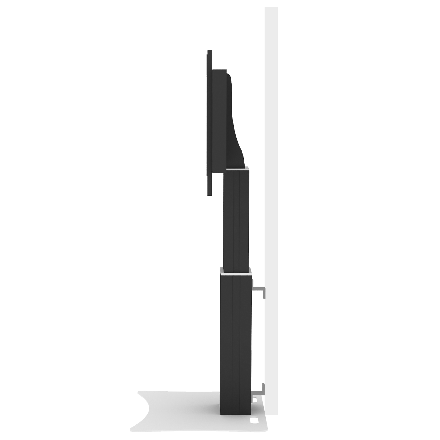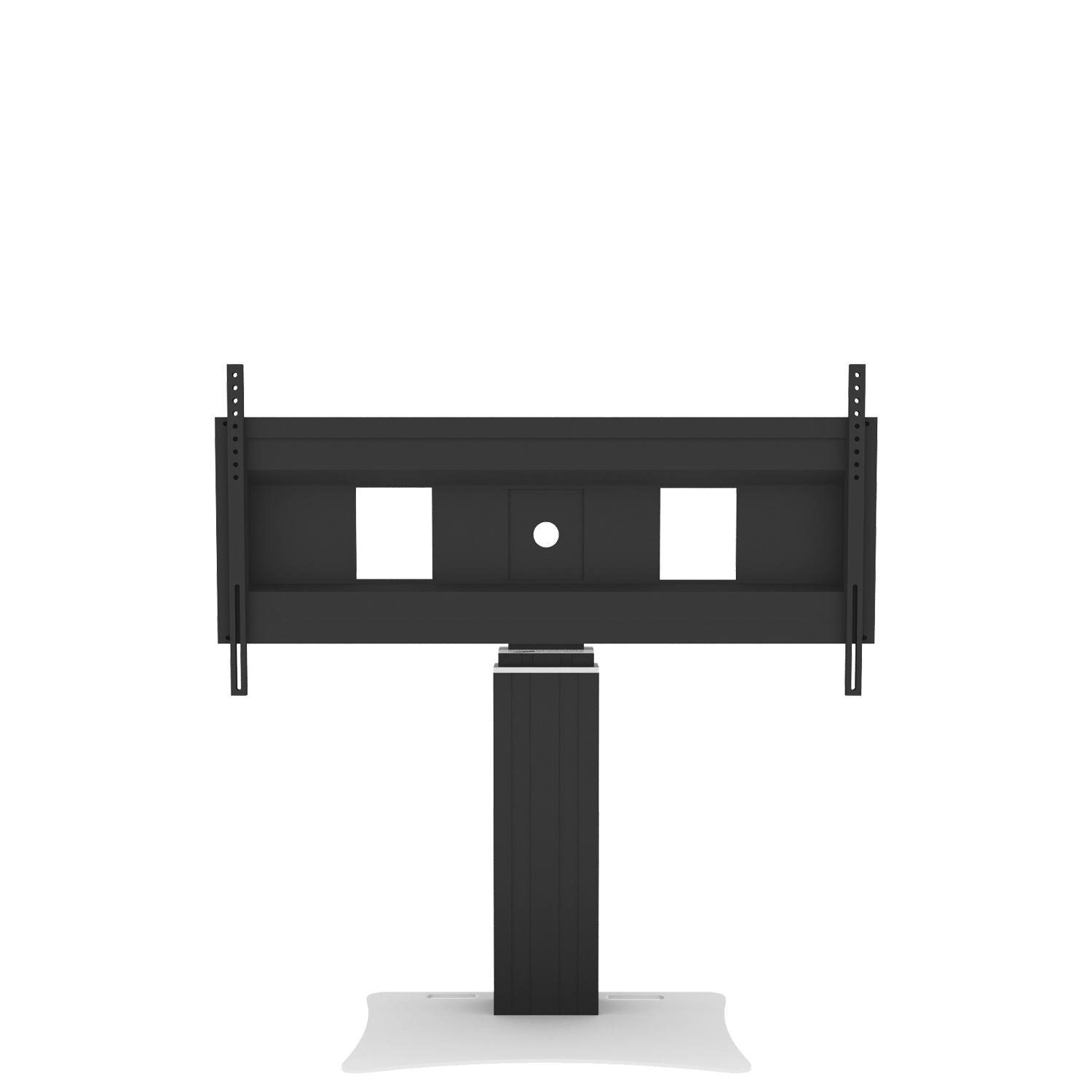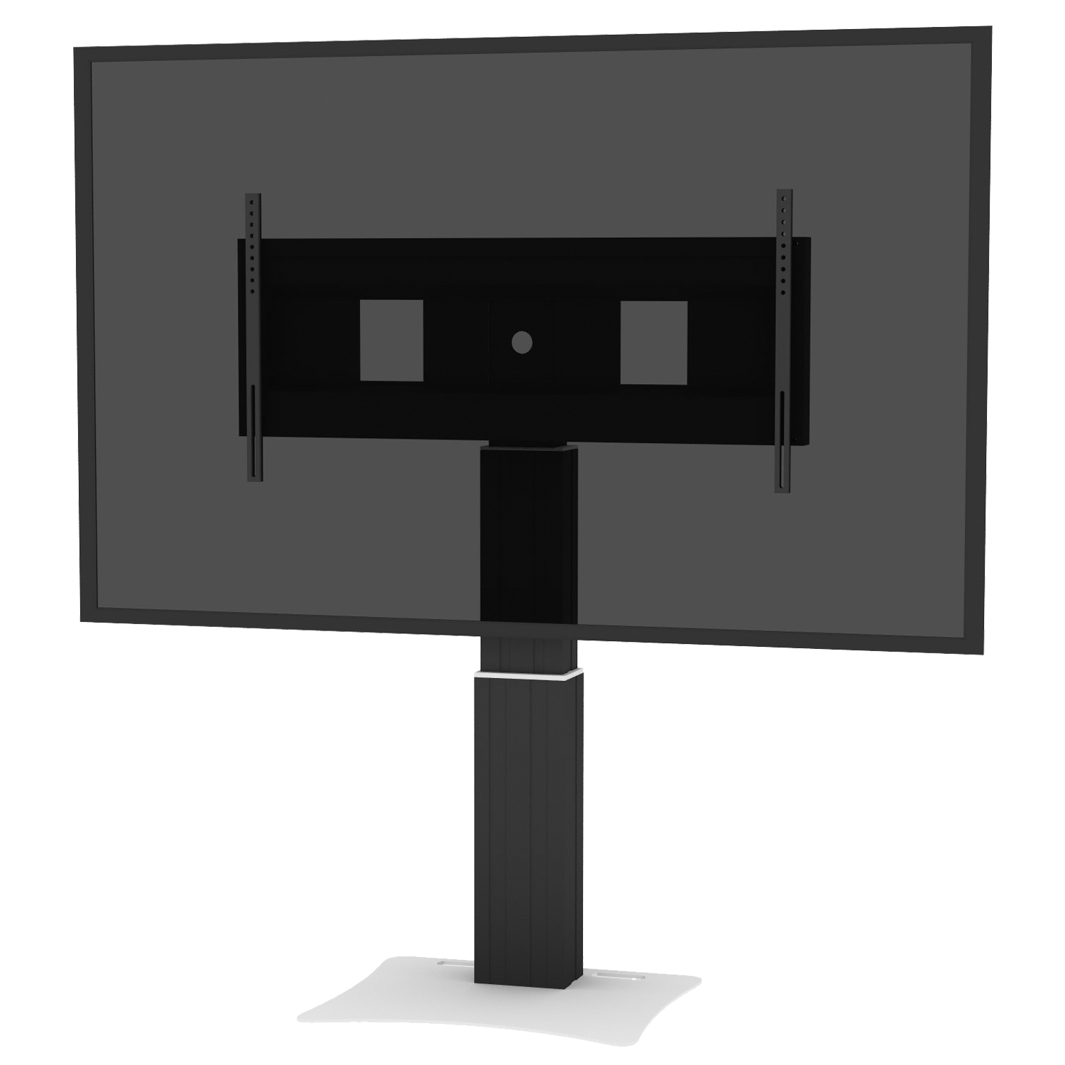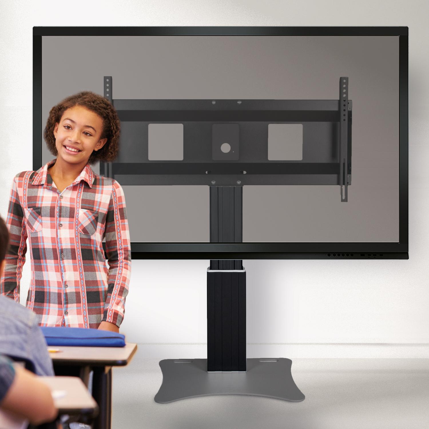 Elektrisch in hoogte verstelbare monitorstandaard standaard; tv-muurbeugel met XL-beeldschermbeugel. Speciaal ontwikkeld voor montage van touchscreen monitoren. De gemotoriseerde, in hoogte verstelbare tv-muurbeugel is voorzien van een extra breed frame voor beeldschermmontage. Het systeem wordt geleverd met de 2-delige Conen Mounts mastkolom en 50 cm hoogteverstelling. Onder de mastkolom wordt een 8 mm dikke staalplaat bevestigd. De monitorstandaard kan vrijstaand in de kamer worden geplaatst of aan een lichtgewicht muur worden gemonteerd. Uitsparingen/handgrepen in de bodemplaat vergemakkelijken het hanteren. Het bord is zwart gepoedercoat in kunststof. Het systeem wordt gedemonteerd geleverd in drie pakketten en kan per koerier worden verzonden.
