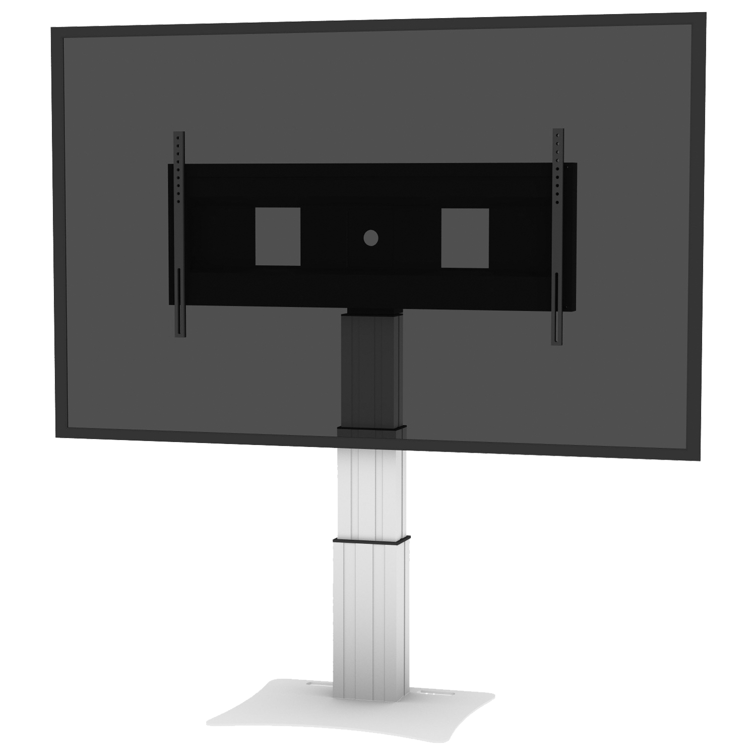 Elektrisch in hoogte verstelbare monitorstandaard standaard; monitormuurbeugel met XL-beeldschermbeugel. Speciaal ontwikkeld voor montage van touchscreen monitoren. De gemotoriseerde, in hoogte verstelbare tv-muurbeugel is voorzien van een extra breed frame voor beeldschermmontage. Het systeem wordt geleverd met de 3-delige Conen Mounts mastkolom en 70 cm hoogteverstelling. Onder de mastkolom wordt een 8 mm dikke staalplaat bevestigd. De monitorstandaard kan vrijstaand in de kamer worden geplaatst of aan een lichtgewicht muur worden gemonteerd. Uitsparingen/handgrepen in de bodemplaat vergemakkelijken het hanteren. De plaat is van kunststof gepoedercoat in wit aluminium. Het systeem wordt in twee pakketten gedemonteerd geleverd en kan per koerier worden verzonden.