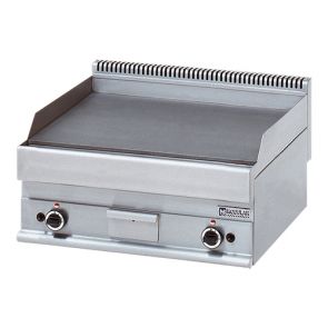 GAS - bakplaat vervaardigd van glad geslepen gegoten speciaal staal maximaal benut bakplaat oppervlak zeer snelle verhittingstijd d.m.v. een dubbele gasbrander per zone. Voorzien van thermostatische veiligheidsklep thermokoppel piezo electrische ontsteking en extra grote ingebouwde vetopvanglade.@@Standaard uitvoering aardgas ook leverbaar op propaangas.@@De 70 cm modules zijn voorzien van 2 onafhankelijk instelbare verhittingszones H cm:28 L cm:70 B cm:65 kW:114 70 cm module - GLAD Type:65_70 FTGP propaan