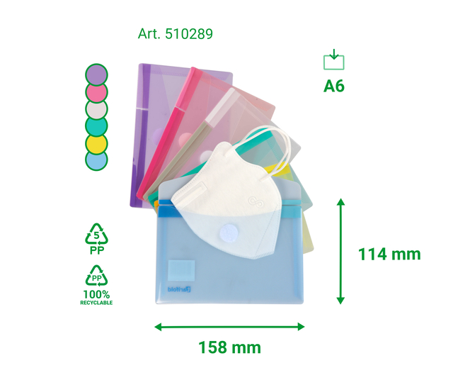 * 6 Heldere zeefdruk enveloppen met klittenbandsluiting.