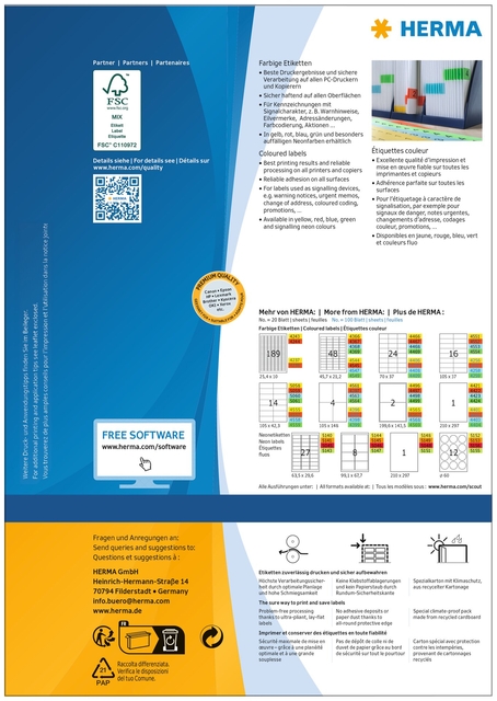 Herma is een toonaangevende fabrikant van zelfklevende etiketten en etiketteersystemen. Het bedrijf is opgericht in 1906 in het Duitse Stuttgart en heeft zich sindsdien ontwikkeld tot een wereldwijde speler op het gebied van labeloplossingen. Het merk staat bekend om zijn hoogwaardige producten en innovatieve oplossingen voor een breed scala aan toepassingen.