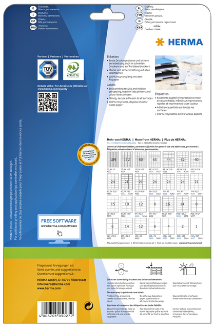 Herma is een toonaangevende fabrikant van zelfklevende etiketten en etiketteersystemen. Het bedrijf is opgericht in 1906 in het Duitse Stuttgart en heeft zich sindsdien ontwikkeld tot een wereldwijde speler op het gebied van labeloplossingen. Het merk staat bekend om zijn hoogwaardige producten en innovatieve oplossingen voor een breed scala aan toepassingen.