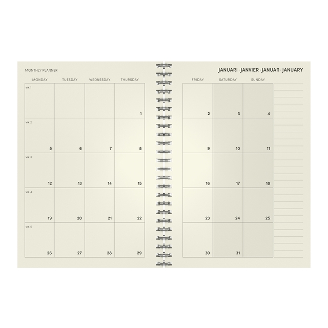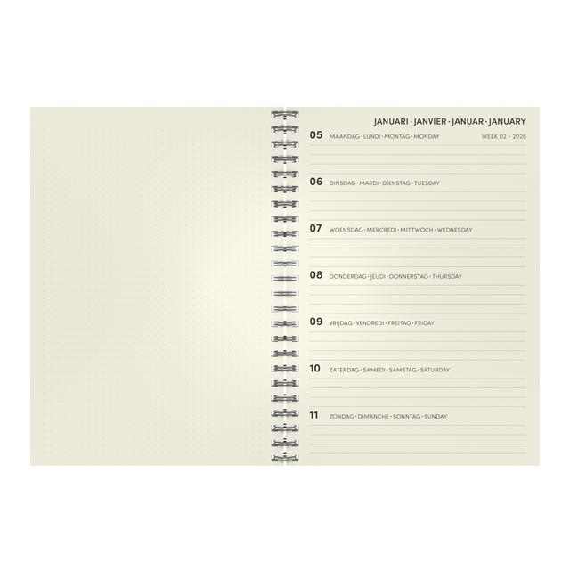 Deze A5 Daily Planner 2026 combineert functionaliteit met een bubblicious hip design. Met een overzichtelijke indeling van 7 dagen op 2 pagina’s en extra ruimte voor notities, biedt deze planner alles wat je nodig hebt om jouw planning efficiënt te beheren. De jaar- en maandplanners helpen je vooruit te kijken, terwijl de stickervel met maandtabs zorgt voor extra gebruiksgemak. Dankzij de stevige metal wire-o binding blijft de planner perfect openliggen, en de elastische sluiting houdt alles netjes bij elkaar. De luxe matte afwerking met spot UV-details en crèmekleurige pagina’s geven deze planner een elegante uitstraling. 📌 Kenmerken: ✔ Praktische indeling: 7 dagen per 2 pagina’s + ruimte voor notities ✔ Overzichtelijke jaar- en maandplanners ✔ Multitaal: beschikbaar in Nederlands, Frans, Duits en Engels ✔ Duurzame wire-o binding voor een platliggende planner ✔ Luxe afwerking: matte cover met spot UV-details ✔ Extra handig: stickersheet met maandtabs