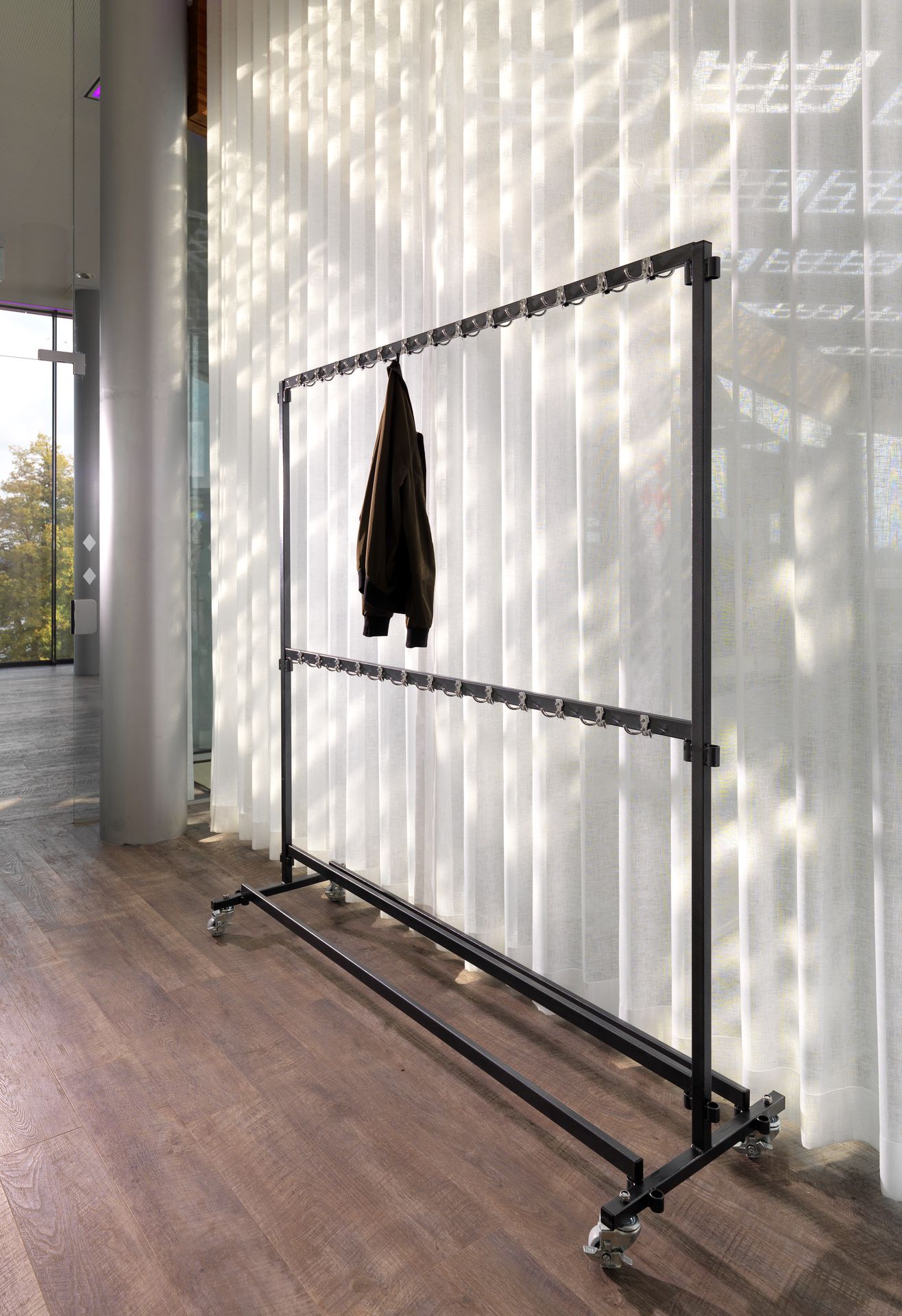 Deze garderobe is met zijn 104 haakjes ideaal om een grote hoeveelheid jassen op een gestructureerde, efficiënte en nette manier op te hangen. De wielen maken de garderobe makkelijk verrijdbaar en dankzij de rem op de wielen is de garderobe ook makkelijk vast te zetten. De koppelpunten maken het mogelijk om de garderobe te koppelen met andere garderobes. Op deze manier kunnen ruimtes snel en efficiënt ingericht worden. De garderobe is verkrijgbaar in verschillende afmetingen, demontabel en gemakkelijk te vervoeren op de bijbehorende trolleys.