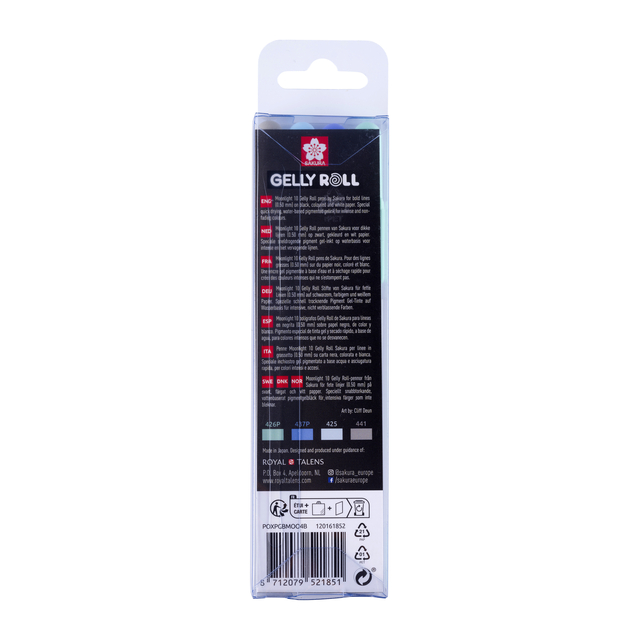 * Een set van 4 Gelly Roll Moonlight gelpennen in de kleuren Pastelgroen, Pastelblauw, Hemelsblauw en Lichtwarmgrijs. * Gelly Roll Moonlight 10 heeft een medium punt voor een kleurrijk en geheel eigen effect. Met de kogel van 1,0 mm teken je een dikke lijn van 0,5 mm. * De soepele, dekkende inkt is perfect voor tekenen, doodlen en kleuren. Gelly Roll Moonlight heeft de felste en meest levendige kleuren van de Gelly Roll familie. Alle kleuren zijn helder op wit papier en bieden ook uitstekende effecten op zwart papier. De fluorescerende kleuren gloeien zelfs onder blacklight! * De Sakura Gelly Roll bevat een speciale gel inkt met pigment op waterbasis voor felle, krachtige kleuren die niet vervagen wanneer je ze uit direct zonlicht houdt. Dankzij de unieke gel inkttechnologie is de inkstroom altijd constant, zonder druk uit te hoeven oefenen. * Moonlight Gelly Roll pennen zijn verkrijgbaar in fijne en medium lijnbreedtes en verschillende heldere kleuren, waaronder fluorescerende en pastelkleuren.