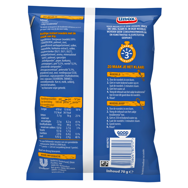 * Deze noodles van Unox zijn de ideale snack voor de lekkere trek. * Doe de noedels in een kom, voeg kokend water toe en binnen 3 minuten kun je genieten van een portie overheerlijke noodles in diverse smaken. * Kruidige instant noedels met de smaak van kip.