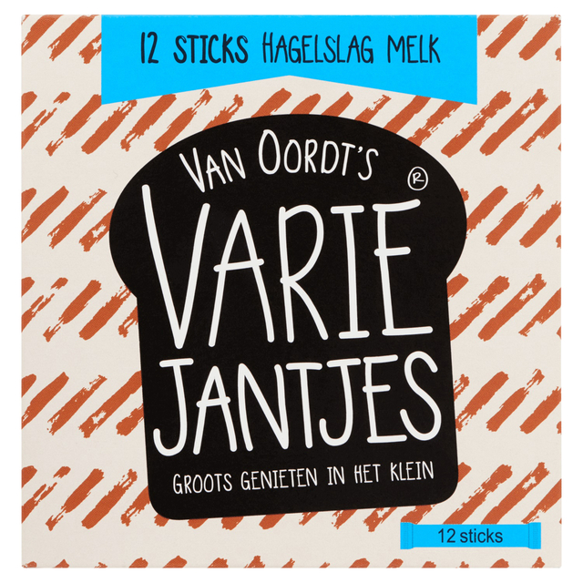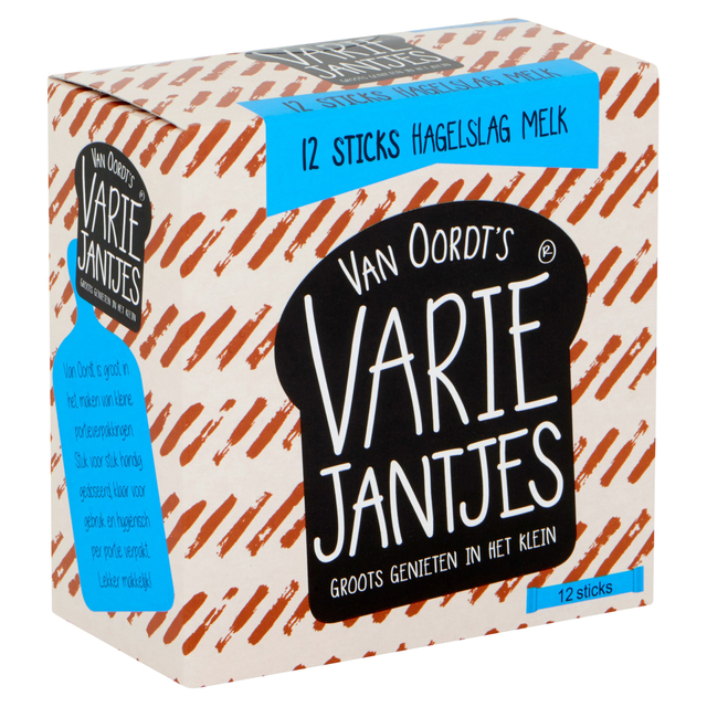 * Een écht feestje aan de ontbijttafel creëert u met Van Oordt VarieJantjes hagelslag melk! * Lekker voor op brood, beschuit of door de yoghurt. * Onze hagelslag gemaakt van melk chocolade is verpakt in een praktische kleinverpakking met een inhoud van 10 gram. * Precies genoeg om één boterham te beleggen!