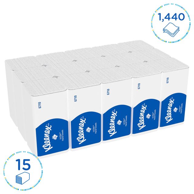 * Kleenex Ultra 3-laags gevouwen papieren doekjes 6710 15 pakken x 96 handdoeken (1440 in totaal) * Maak uw ervaring in de toiletruimte aangenamer met het vertrouwde merk Kleenex®, ontworpen om een ongeëvenaarde ervaring te bieden en tegelijkertijd hoge hygiënestandaarden op de werkplek te ondersteunen. Kleenex® Ultra™ gevouwen handdoeken hebben de voorkeur van gebruikers voor ongeëvenaarde zorg in exclusieve toiletruimten. * Met deze zachte en dikke 3-laags papier handdoeken laat u aan gebruikers zien dat u voor hen zorgt, terwijl de Airflex™-technologie in elke handdoek voor eenmalig gebruik handen effectief en efficiënt droogt en hoge hygiënenormen in uw toiletruimte ondersteunt. * Ineengevouwen papieren handdoeken zijn ontworpen voor afgifte van één stuks tegelijk. Deze doseringsmethode van één vel tegelijk is ontworpen om de handhygiëne te verbeteren door het risico van besmetting tijdens het afdrogen van de handen tot een minimum te beperken, omdat de gebruiker alleen het gebruikte vel aanraakt. Het doseren van één papieren handdoek per keer is ook bedoeld om de gebruikskosten te verlagen, omdat de gebruiker alleen de papieren doekjes neemt die hij nodig heeft om zijn/haar handen af te drogen. * Onze aanraakvrije dispensers verminderen het risico van kruisbesmetting. * Deze handdoeken zijn voorzien van compressietechnologie voor een betere duurzaamheid doordat minder opslagruimte nodig is en het transportkosten bespaart. * Compatibel met diverse dispenseropties voor papieren handdoeken van Kimberly-Clark: Aquarius™ Dispensers in wit of zwart (productcodes 6945 en 7171), een dispenser met hoge capaciteit (code 9962) en een roestvrijstalen dispenser met hoge capaciteit (code 8971). * Met FSC- en Europees Ecolabel-keurmerken voor milieugarantie. Gecertificeerd voor contact met voedsel. * Eén bundel Kleenex® Ultra™ gevouwen papieren handdoeken bevat 96 stuks gevouwen handdoeken. * Afmeting bij gevouwen (b x l): 215x106mm. * Afmeting bij ongevouwen (b x l): 215x318mm.