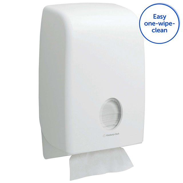 * Aquarius dispenser voor ineengevouwen papieren doekjes 6945 * Creëer een hygiënische en harmonieuze toiletruimte-ervaring met de Aquarius™ Dispenser-serie, ontworpen om perfect samen te werken met de bekende en vertrouwde merken Kleenex® en Scott®. Deze toiletruimte handdoekdispensers zijn ontworpen ter ondersteuning van hygiënestandaarden en bieden een consistente hygiëneoplossing voor de toiletruimten die is afgestemd op de hygiënebehoeften van uw werkplek. * Onze Aquarius™-dispenser voor gevouwen papieren handdoekjes combineert innovatie en stijl met uitzonderlijke prestaties. Deze dispenser voor gevouwen doekjes heeft een gestroomlijnd en afgerond ontwerp zodat vuil niet ophoopt en hij eenvoudig in één enkele beweging kan worden gereinigd. Het volledig gesloten dispensersysteem zorgt ervoor dat u alleen het product aanraakt dat u gebruikt. Dit helpt de hoge hygiënestandaarden op de werkplek te ondersteunen. * De grote capaciteit van deze dispenser voor papierendoekjes zorgt ervoor dat er altijd een product beschikbaar is. * Het bijvullen van de Dispenser is eenvoudig en het probleemloze onderhoud houdt de kosten laag op plaatsen waar het apparaat veel wordt gebruikt. Vastlopen, verspilling en kosten worden tot een minimum beperkt door de unieke, gepatenteerde overschot-inrichting van deze handdoekdispenser, die ook is ontworpen voor een soepele doseerervaring. * Deze dispenser voor gevouwen papieren handdoeken levert ineengevouwen handdoeken van één vel. * De Aquarius™-Dispenser voor gevouwen handdoeken heeft ook een verborgen slot voor navullen en een venster om te anticiperen op het opraken van de handdoeken. * Onze aanraakvrije dispensers verminderen het risico van kruisbesmetting. * De witte Aquarius™-Dispenser voor gevouwen papieren handdoeken is ook verkrijgbaar in het zwart (code 7171), dus er is voor elke toiletruimte een geschikt exemplaar. Deze dispenser heeft een afmeting van 39,9 cm (H) x 26,5 cm (B) x 13,6 cm (D). De Kimberly-Clark-Dispenser is compatibel met een verscheidenheid aan gevouwen handdoeken van Kleenex® en Scott® van Kimberly-Clark, aanbevolen worden: 6637, 6710, 6659, 6663, 6669, 6677, 6682, 6778, 6789, 3749 en 4632. Het is ook compatibel met: 6633, 6647, 6649, 6664, 6689, 6764, 6771, 6772, 6773, 6777 en 7979.