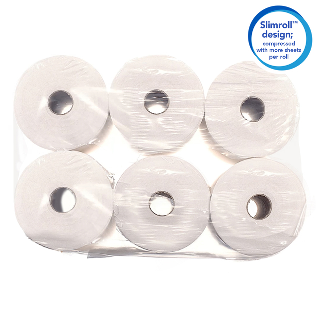 * Scott Slimroll papieren Handdoeken 6657 - 6 x 165 m witte, 1-laags rollen * Scott® Slimroll handdoeken zijn zachter, absorberender en sterker dan conventionele handdoeken en bieden een constante kwaliteit voor een betaalbare prijs. Het slimme Slimroll™ ontwerp betekent dat er meer papieren handdoekjes per rol in uw dispensers passen, waardoor de navulbehoefte wordt verminderd. Deze papieren handdoeken zijn ook gecertificeerd voor voedselcontact, waardoor ze ideaal zijn voor plaatsen waar contact is met voedsel en toiletruimtes in drukke kantoren en hotels. De unieke Airflex™ Technologie zorgt ervoor dat de lichtgewicht 1-laagse doek absorberend en sterk is wanneer deze nat wordt, waardoor deze niet doorweekt raakt of scheurt. * Scott® Slimroll papieren handdoekjes zijn gemaakt van 100% gerecycled materiaal en voorzien van het Europese Ecolabel: uw garantie dat elke stap van het productieproces verantwoordelijk is uitgevoerd. * Individueel doekformaat 19. 8 cm (B). * Geschikt voor Aquarius™ Slimroll™ Handdoek Dispensers (productcodes 6953 en 6969) en Kimberly-Clark Professional™ Slimroll™ gerolde handdoek Dispenser (productcode 9960). 6 x 165 m witte, 1-laags rollen (990 m in totaal) * Het Scott Slimroll™ ontwerp is super gecomprimeerd met meer doeken per rol, voor ruimtebesparing en minder vaak verwisselen van rollen * Gemaakt met de unieke Airflex™ Technologie. Zacht, sterk en uiterst absorberend, zelfs wanneer ze nat zijn Voorzien van het Europese Ecolabel