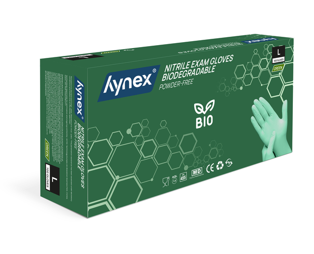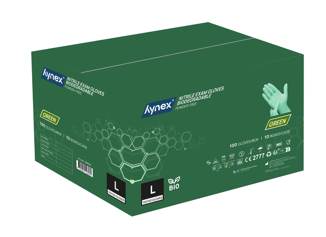 Duurzaam & comfortabel: biologisch afbreekbare nitril wegwerphandschoenen van Hynex Ontdek de nieuwste toevoeging aan het Hynex-assortiment: biologisch afbreekbare nitril wegwerphandschoenen. Met de introductie van deze biologisch afbreekbare handschoenen zetten we een logische stap in onze duurzame koers – zonder concessies te doen aan het ultieme draagcomfort en de optimale bescherming. En zoals je van Hynex gewend bent, geniet je nog steeds van de beste prijs-kwaliteitverhouding. Kies voor milieuvriendelijk gemak, zonder in te leveren op prestaties! Biologisch afbreekbare nitril wegwerphandschoenen De biologisch afbreekbare nitrilhandschoenen vormen een duurzaam alternatief. Dankzij de innovatieve toevoeging van bio-agentia in de formule behouden ze dezelfde betrouwbaarheid als gewone nitril wegwerphandschoenen. Dit betekent dat ze, zodra ze in contact komen met specifieke micro-organismen in de bodem, op natuurlijke wijze worden afgebroken zonder schadelijke resten achter te laten. Voor jouw gebruiksgemak Gemaakt van 100% biologisch afbreekbaar nitril, zijn deze handschoenen poedervrij en oppervlakte-gechloreerd voor extra comfort. Ze bieden een superieure sterkte, verbeterde lekbestendigheid en uitstekende chemische spatbescherming. Nitril heeft als eigenschap dat dit goed vormt naar de hand tijdens gebruik. Hierdoor heb je een goede grip, ook bij het werken in of met natte of geoliede producten of omgevingen. De getextureerde vingertoppen zorgen voor een betere grip bij zowel natte als droge omstandigheden, terwijl ze ook zorgen voor een optimale tastgevoeligheid waardoor ze een precieze aanraking mogelijk maken. Bovendien bieden deze handschoenen betrouwbare bescherming tegen bacteriën en schimmels. De gekrulde rand extra biedt extra gemak bij het aan- en uittrekken, zorgt ervoor dat vloeistoffen niet langs de arm lopen en voorkomt het terugdraaien van de handschoenen. Bovendien zijn ze zowel links als rechts te dragen Sterk en betrouwbaar Nitril wegwerphandschoenen zijn sterker dan latex, rubber of vinyl handschoenen. Ze voorkomen besmettingsgevaar tijdens werkzaamheden waar hygiëne voorschriften belangrijk zijn. Werk je in de voedingsmiddelenindustrie, laboratoria, horeca of zorgsector? Dan zijn deze handschoenen de beste keuze! Nitril voor iedereen Verminder de kans op een latex allergie door puur en alleen nitril handschoenen te gebruiken. Tijdens het gebruik wordt huidirritatie voorkomen doordat de nitril handschoenen latex- en poedervrij zijn. Let op: niet steriel en geschikt voor eenmalig gebruik. Draag wegwerphandschoenen niet te lang, probeer ze elk 2 uur te vervangen voor een nieuw paar. Specificaties:  * Materiaal: Nitril * Ongepoederd & latexvrij * Maat: L * Kleur: Groen * Grammage: 3,5 gr * Verpakking: 100 stuks per doos * Niet steriel