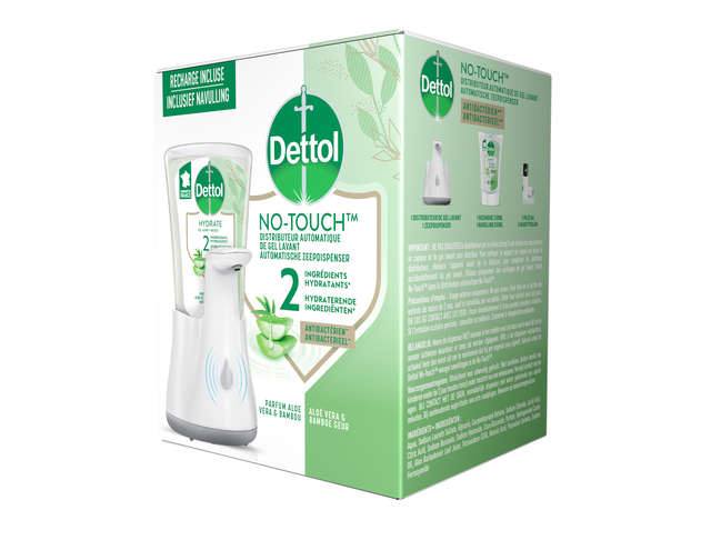 * Dettol No-Touch Antibacteriële Wasgel Aloë Vera kit, bestaat uit een automatische zeepdispenser inclusief 250ml vulling. * Je hoeft de pomp niet aan te raken, waardoor je de verspreiding van bacteriën voorkomt. * De antibacteriële zeep houdt de handen hygiënisch schoon en beschermd. Met aloë vera voor een frisse geur en een gehydrateerde huid. Dermatologisch getest.* De Dettol No- Touch zeepdispenser helpt op een creatieve manier te beschermen tegen bacteriën. * Uw handen worden automatisch gedetecteerd en een dosis zeep wordt vrijgegeven. * Inclusief 2 AA batterijen * Dettol- Zacht voor de huid, hard tegen vuil en bacteriën.