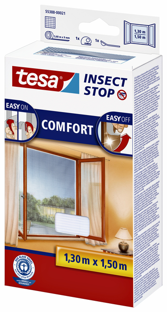 * tesa® Insect Stop COMFORT Klittenband voor ramen is een bescherming tegen muggen en insecten dat met een speciaal systeem zo kan worden geplaatst en verwijderd. * Het bevat een easy-on- en easy-off-oplossing waarmee je het raam open kunt laten staan en de muggen en andere insecten buiten kunt houden. * Deze zeer effectieve hor is verkrijgbaar in twee kleuren en verschillende maten, geschikt voor de meeste kozijnen. * De Insect Stop is snel en eenvoudig te plaatsen: plak de meegeleverde klittenbandtape gewoon op het raamkozijn, druk het gaas ertegen en je bent klaar. * Verwijderen van het gaas is al net zo eenvoudig en laat geen zichtbare sporen achter. * Afmeting 1.30x1.50m. * Wit. * UV-bestendig. * Wasbaar op max 30°C. * Herbruikbaar.