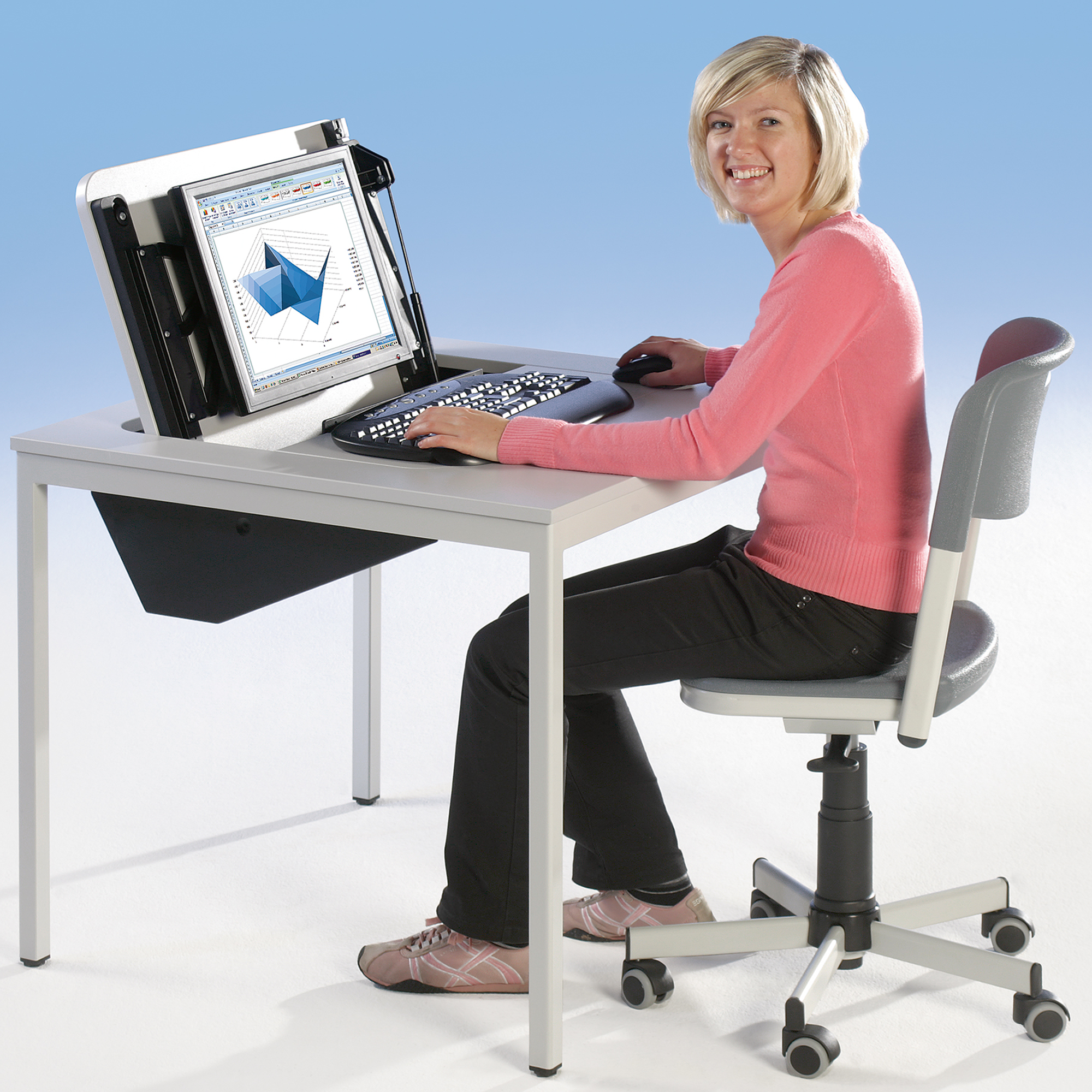Afsluitbaar, robuust, duurzaam, praktisch - het is magisch! De computertafel biedt plaats aan flatscreen monitoren tot 19" in de uitschuifbare klep. Monitor, toetsenbord en muis zijn inschuifbaar. Zo hoef je niet meer te herschikken en creëer je in een handomdraai ruimte op je bureau. De stabiele 4-poot stalen buisframe met 30x30 mm profiel en de 19 mm dikke melaminehars gecoate spaanplaat met ABS randen bieden een hoogwaardige werkplek. De tafel heeft een ingebouwde klep die kan worden afgesloten. kabeluitgang voor monitor, toetsenbord, muis en stroomkabels: 60cm x 50cm, toetsenbordlade: 60cm x 24cm