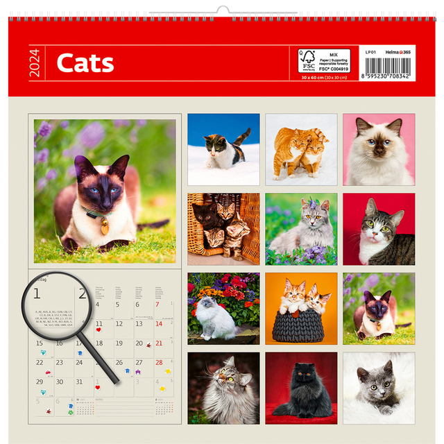 Met zorg vervaardigd, pronkt onze kalender met een stevige spiraalbinding die ervoor zorgt dat hij perfect recht aan je muur hangt. Gemaakt van FSC-gecertificeerd papier, is het niet alleen een traktatie voor kattenliefhebbers, maar ook voor het milieu.
