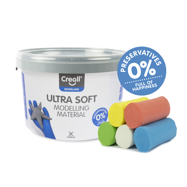 * Creall ultra soft klei is zeer soepel en gemakkelijk kneedbaar boetseermateriaal voor het jonge kind vanaf 2 jaar. * Zijdezacht. * Wordt niet hard, droogt niet uit en is steeds opnieuw te gebruiken. * Ondersteunt de ontwikkeling van de fijne motoriek. * Naast de ontwikkeling van pols en duim gewricht, worden ook de vingers afzonderlijk gestimuleerd. * Wanneer de klei wat stugger aanvoelt verdeel de rollen klei dan in kleine plakken, op deze manier wordt de klei snel zacht en soepel. * Glutenvrij. * In handige emmer om de klei in te bewaren. * Kleuren: rood, groen, blauw, geel en wit. * Inhoud: 1100 gram.