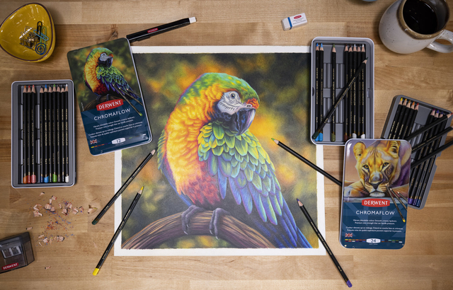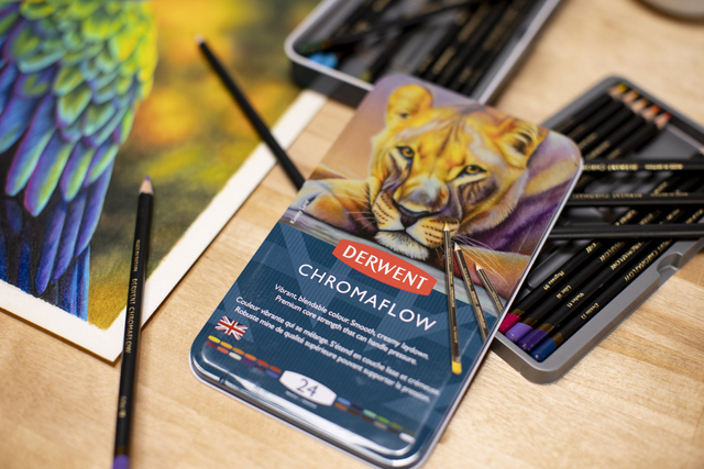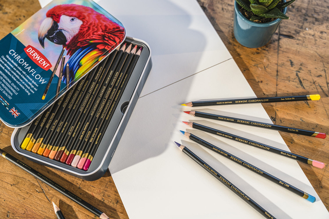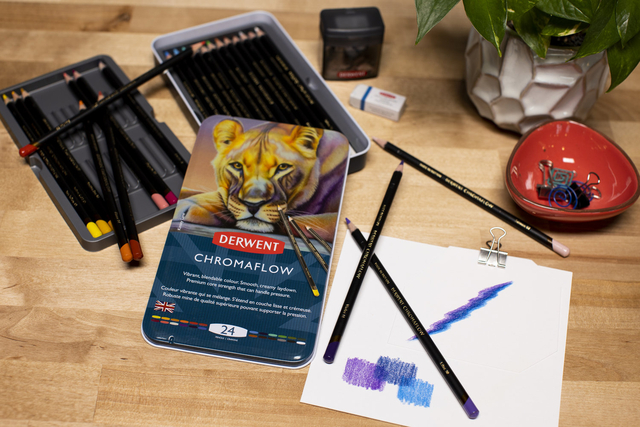 * Creëer in het oog springende kunstwerken met deze Derwent Chromaflow kleurpotloden in blik. * Deze kleurpotloden zijn speciaal ontworpen voor kunstenaars en professionals en beschikken over klassieke, levendige, mengbare kleuren met een gelijkmatige laydown. * Derwent Chromaflow potloden zijn samengesteld met rijk pigment, om altijd gewaagde, levendige kleuren te creëren. * De potloden kunnen druk weerstaan wanneer ze worden geslepen of in gebruik zijn. * Geniet elke keer weer van constante, betrouwbare kwaliteit. * De potloden zijn geschikt voor alle stijlen en technieken, eenvoudig mengen en laagjes aanbrengen dankzij de gladde textuur. * De potloden hebben een sterke kern van 3,5mm. Dit hoogwaardige blik met 24 potloden bevat de volgende kleuren: Sun Yellow, Amber Gold, Golden Sun, Flame, Scarlett, Strawberry, Salmon, Blush Pink, Magenta, Lilac, Violet, Denim, Blue, Light Blue, Turquoise, Basil, Foliage, Grass Green, Burnt Sienna, Raisin, Natural Brown, Platinum, Black, White.