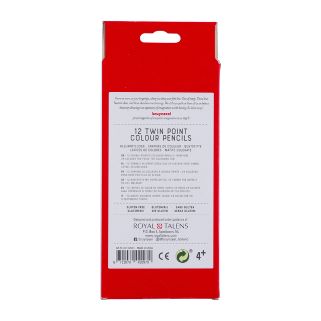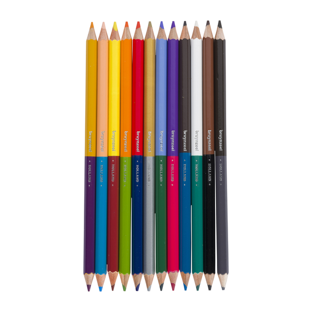 * Beleef dubbel zoveel kleurplezier met de 2 kleuren potloden van Bruynzeel! * Je hoeft niet hard te drukken om toch prachtige kleuren op papier te krijgen! * Deze potloden hebben niet maar één maar twee punten en aan beide kanten een andere kleur. * Er zit ook een goud/zilver potlood bij, dus je kan je fantasie de vrije loop laten om prachtige tekeningen te maken! *De verpakking bevat 12 dubbelpunt kleurpotloden. * Geschikt voor kinderen vanaf 5 jaar. * Kenmerken: goede kleurafgifte, hoge kwaliteit pigmenten, Intense kleuren, Kleurkern dubbel verlijmd aan het hout, Verantwoord verkregen hout, Glutenvrij.