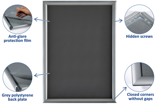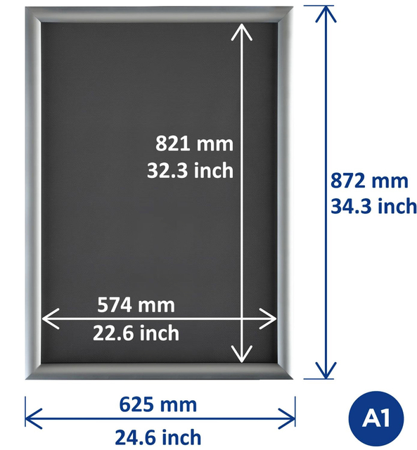 Geef je posters een stijlvol podium met onze veelzijdige Europel Premium aluminium kliklijst. Deze hoogwaardige kliklijst, ook bekend als posterlijst of wissellijst, biedt een snelle, eenvoudige en representatieve presentatie van je A1 posters. Belangrijkste kenmerken: * Hoogwaardige kwaliteit: In tegenstelling tot veel andere kliklijsten op de markt, onderscheidt deze kliklijst zich door de premium materialen en afwerking, waardoor hij duurzamer en steviger is. * Easy-Click Systeem: Dankzij het Easy-Click systeem is het presenteren van je boodschap snel, eenvoudig en altijd representatief. * Ontspiegelde voorzetfolie: De heldere, transparante ontspiegelde voorzetfolie beschermt je poster tegen vuil en vocht, terwijl het zorgt voor een heldere en scherpe weergave van je boodschap. * Verstekhoek profiel: Het profiel met verstekhoek geeft de kliklijst een moderne look en draagt bij aan de stabiliteit. * Geschikt voor A1 formaat: Perfect afgestemd op papierformaat A1, maakt deze kliklijst een veelzijdige keuze voor diverse presentaties. Kies de maat die bij jou past! * Frame dikte van 25mm: Met een frame dikte van 25mm valt de kliklijst op, en blijft de aandacht gericht op je poster. * Flexibele ophangmogelijkheden: Hang de lijst zowel horizontaal als verticaal op, afhankelijk van de ruimte en omgeving waarin je deze gebruikt. * Inclusief bevestigingsmateriaal: Het meegeleverde bevestigingsmateriaal, inclusief vier schroeven en vier pluggen, maakt een veilige bevestiging aan de muur mogelijk.