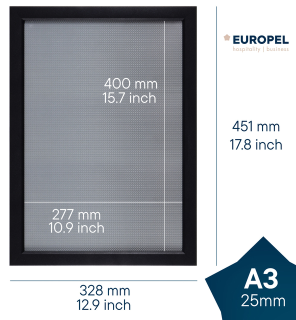 * Verfijn uw presentaties met de Europel Economy Kliklijst zwart voor A3-posters - een elegante oplossing met ons snelle Easy-Click systeem voor zowel efficiëntie als stijl! * Geef uw posters en boodschappen de aandacht die ze verdienen met deze strak vormgegeven kliklijst. * Vervaardigd van duurzaam aluminium en voorzien van een innovatief Easy-Click systeem, maakt deze lijst het mogelijk om uw content snel, moeiteloos en aantrekkelijk te presenteren. * Stijlvol aluminium frame: Uitgevoerd met een scherpe verstekhoek en vervaardigd in de kleur zwart voor een moderne en professionele look. * Easy-Click systeem: Bevestig uw posters snel en gemakkelijk, voor een opvallende presentatie die direct de aandacht trekt. * Robuuste bouw: Gefabriceerd uit hoogwaardig aluminium, biedt de kliklijst een lange levensduur en een chique uitstraling. * Ontspiegelde voorzetfolie: Beschermt tegen vuil en vocht terwijl het zorgt voor een kristalheldere weergave van uw informatie. * Ideaal formaat: Geschikt voor A3-formaat (29,7x42cm), veelzijdig genoeg voor allerlei soorten presentaties. * Overige maten: De economy kliklijsten zijn te verkrijgen in de maten A0, A1, A2, A3, A4, A5, B1 en B2. * Slank ontwerp: Het 25mm dikke profiel zorgt voor een minimalistische flair en houdt de focus op uw inhoud. * Flexibele montage: Eenvoudig te plaatsen zowel horizontaal als verticaal, past in elke ruimte of setting. * Inclusief montagematerialen: Wordt geleverd met alle benodigde schroeven en pluggen voor een veilige bevestiging. * Verhoog de professionaliteit van uw presentaties met onze Europel Economy Kliklijst.