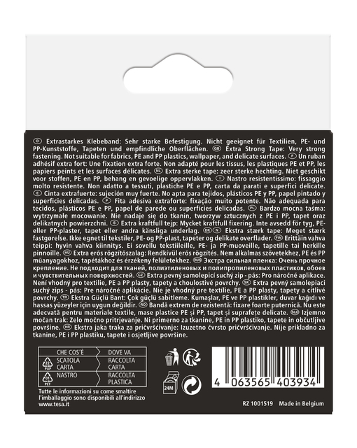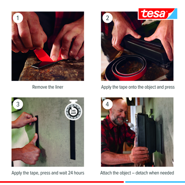 * De tesa® Ultra Power Lock Tape is geschikt voor een groot aantal taken in en rond het huis, de tuin, de auto en nog veel meer. Deze zelfsluitende klittenbandtape met een extra kleeflaag op de drager biedt een uitzonderlijke kleefkracht. Hij is bestand tegen temperaturen van -30 tot +90°C. Het stevige paddenstoelvormige ontwerp zorgt ervoor dat de twee zijden stevig in elke richting in elkaar haken, met een hoorbare "klik" ter bevestiging van een succesvolle verbinding. * Veelzijdig: Deze krachtige klittenbandtape is geschikt voor een groot aantal taken binnen en buiten * Sterke hechtkracht De klittenbandtape is bestand tegen belastingen tot 20 kg/m * Unieke paddenstoelvergrendeling: Dit is de sterkste klittenbandtape in het tesa® assortiment * Krachtige, tweezijdige hechting: Een zelfklevende laag op de drager van de tape zorgt voor extra houvast * Veerkrachtig: UV-bestendig, weerbestendig en bestand tegen temperaturen van -30 tot +90°C * Praktisch: Het klittenband maakt een klikkend geluid om een veilige verbinding aan te geven * Flexibel: De tape blijft goed op zijn plaats zitten, zelfs als hij tegen het plafond wordt aangebracht * Herbruikbaar: De klittenbandbevestiging kan zo vaak als nodig worden geopend en gesloten * Plafondtoepassing: Max. gewicht 0,5 kg; Andere toepassingen: Max. 5 kg, met een hoogte tot 2,7 m