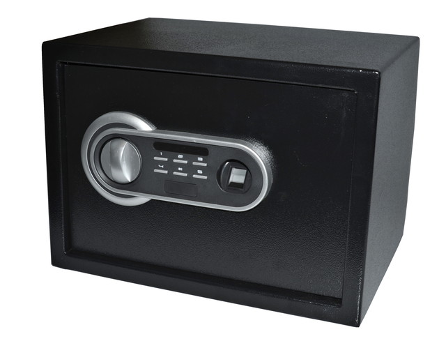 * De Pavo elektronische fingerprint kluis is ideaal voor persoonlijk gebruik of voor op kantoor. * 2 stalen bouten (dubbele bout vergrendeling) garanderen de veilige sluiting van de stalen deur. * De elektronische fingerprintslot is eenvoudig te programmeren met een persoonlijke vingerafdruk scan. * Te programeren tot 100 verschillende gebruikers. * Indien bijvoorbeeld de batterijen leeg zijn, kan de kluis worden geopend met de bijgeleverde noodsleutel. * Ook voorzien van een elektronische cijfercombinatieslot. * De kluis is dus op 3 manieren te openen; d.m.v. digitale cijferslot, fingerprintslot én met de bijgeleverde reservesleutels. * Kan voor de veiligheid gemonteerd worden tegen de muur of op de grond. * Afmetingen kluis: 350x250x250mm – ca. 16 L. * Binnen maten: 225x240x340mm. * Dubbelwandige deurdikte van 4mm dik en bodydikte van 2mm. * Incl. 2x noodsleutels en bevestigingsmateriaal. * Exclusief 4x AA batterijen. * Materiaal: staal.