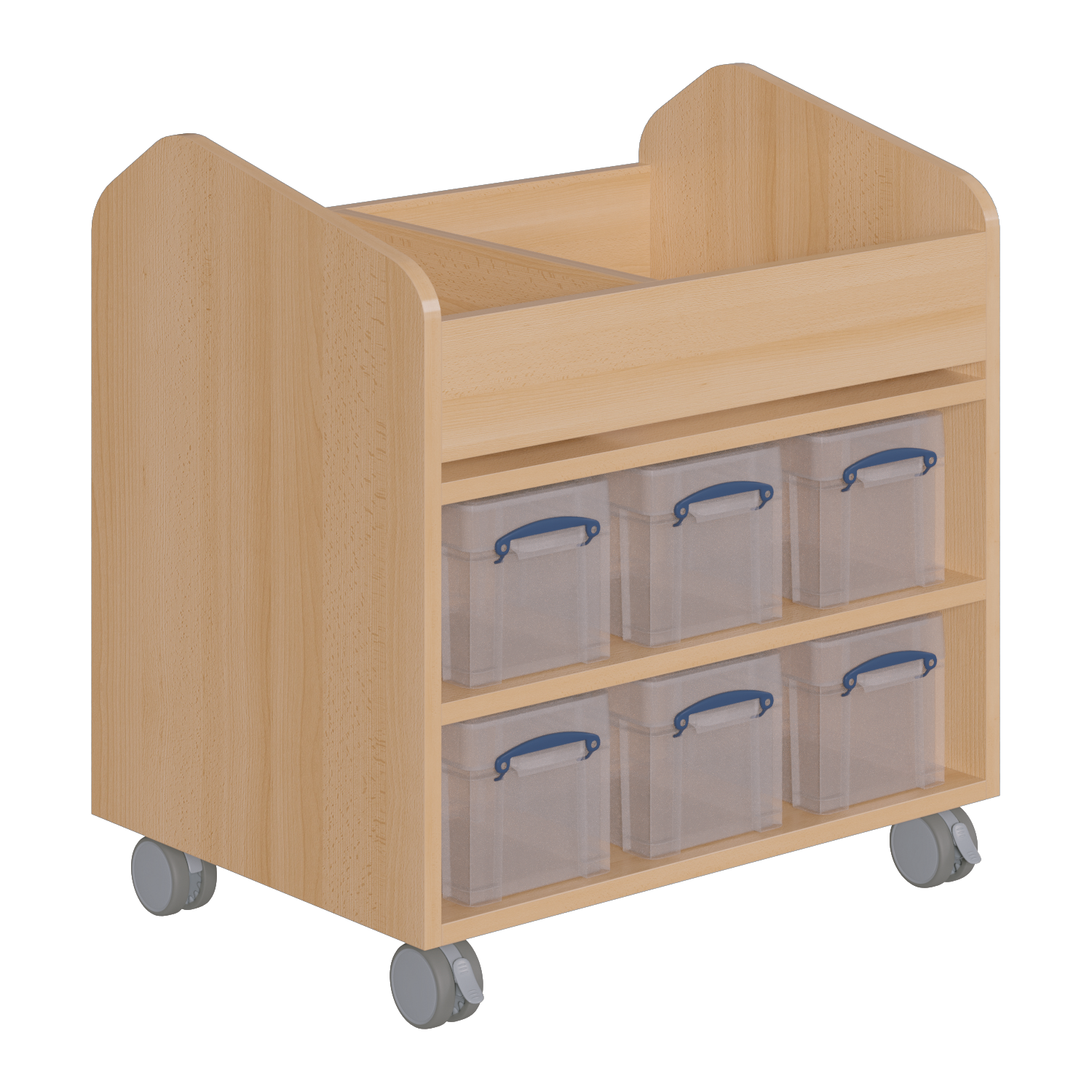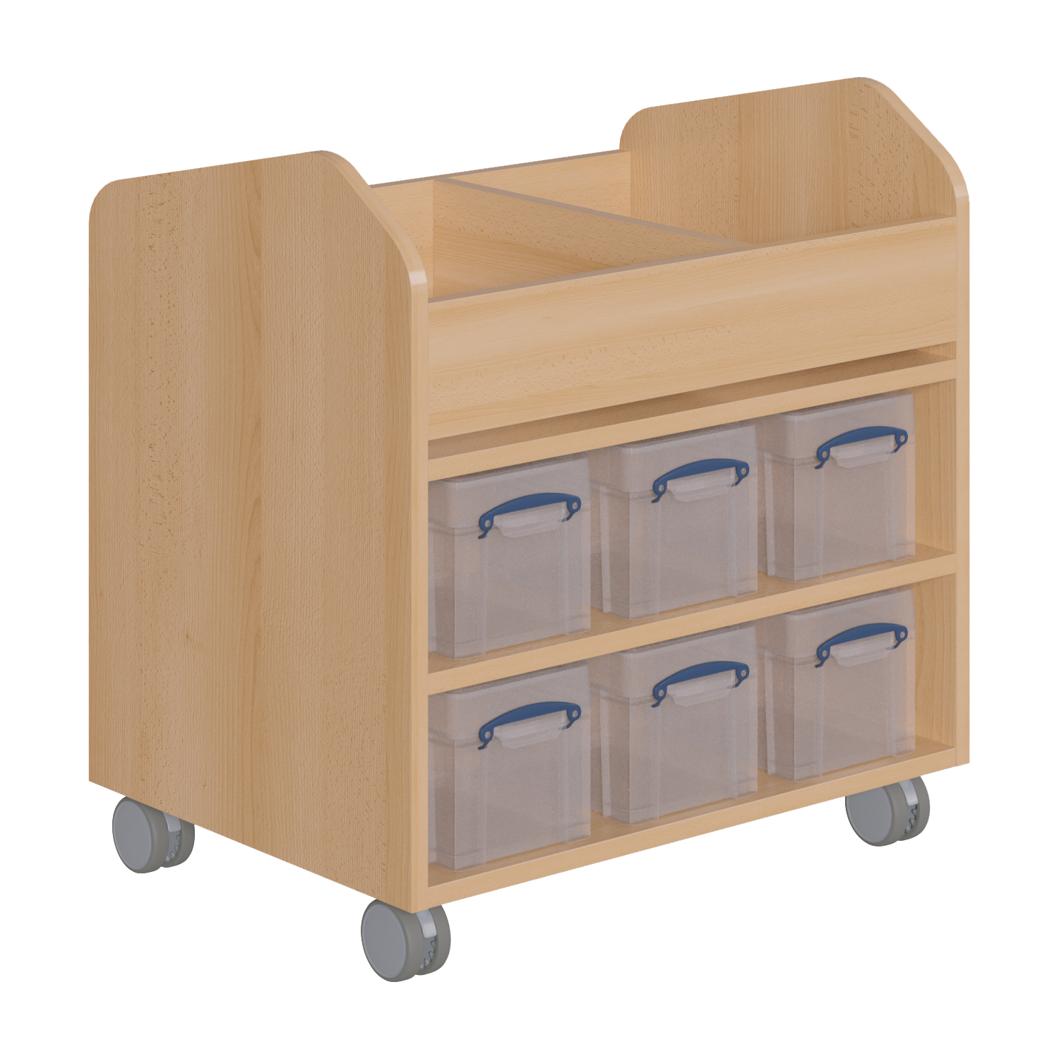 Creatieve trolley & knutselwagen MW1-46 met 2 compartimenten in het bovenste opberggedeelte. Er zijn 6 plastic dozen met deksels onderaan, voor- en achterkant. Afmetingen B/H/D: 70,5x74,3x50 cm
