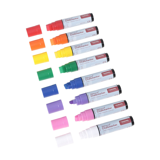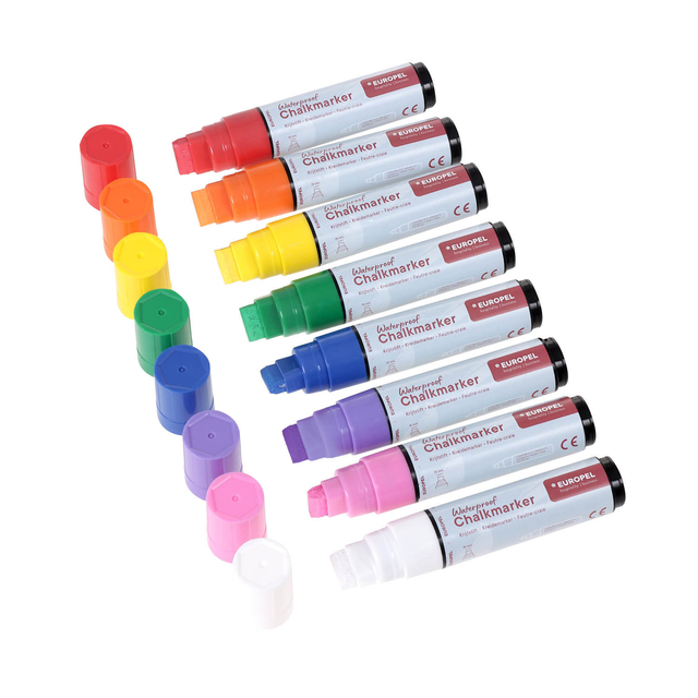 * Ontdek de watervaste krijtstiften 15mm in een 8 kleuren assortiment etui, perfect voor al je creatieve projecten. * Deze set bevat 8 levendige kleuren: rood, paars, blauw, oranje, roze, geel, groen en wit. * Ideaal voor het maken van opvallende borden, raamdecoraties en kunstwerken. * De brede 15mm punt maakt zowel brede als smalle lijnen mogelijk, afhankelijk van de hoek waarin je de stift houdt. * De watervaste inkt zorgt ervoor dat je ontwerpen helder blijven, zelfs bij blootstelling aan water. * Dit maakt ze ideaal voor gebruik op buitenborden, ramen en andere oppervlakken die kunnen worden blootgesteld aan weersomstandigheden. * Je ontwerpen en boodschappen blijven helder en duidelijk, ongeacht de omstandigheden. * Deze stiften zijn gemaakt van niet-giftige materialen, snel drogend en geurloos, wat ze veilig en gebruiksvriendelijk maakt. * Of je nu een kleurrijk menu voor een café wilt maken, een opvallend raamdisplay wilt ontwerpen, of gewoon wil experimenteren met verschillende kleuren in je kunstwerken, deze set heeft alles wat je nodig hebt. * De intense, dekkende kleuren zorgen ervoor dat je ontwerpen echt tot leven komen.
