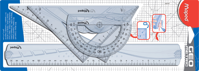 * 4-Delige tekenset: 1 lat van 30 cm, 1 winkelhaak 45°/21 cm, 1 winkelhaak 60°/21 cm en 1 gradenboog 180°/12 cm.