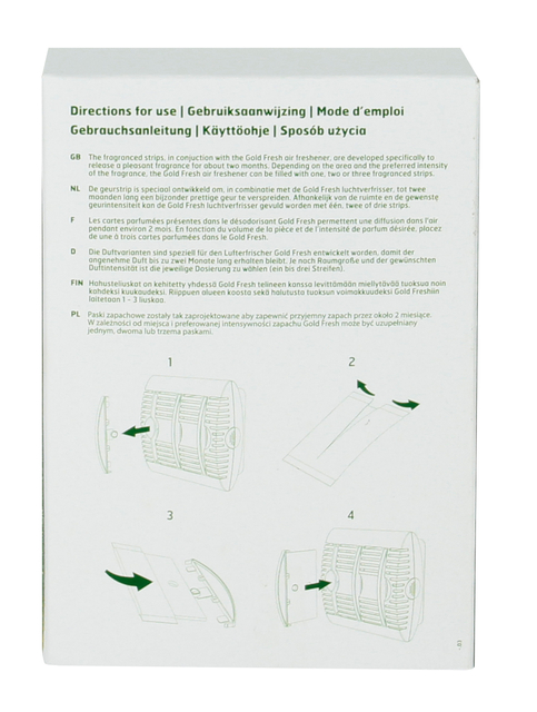 * Geurstrip met een sprankelijke geur van de frisheid van de zee * Deze luchtverfrisser is speciaal ontwikkeld om, in combinatie met de geurstrips, tot twee maanden lang een bijzonder prettige geur te verspreiden. Afhankelijk van de ruimte en de gewenste geurintensiteit kan de Gold Fresh luchtverfrisser gevuld worden met één, twee of drie strips. * Verwisselen van de geurstrips is eenvoudig, snel en probleemloos *