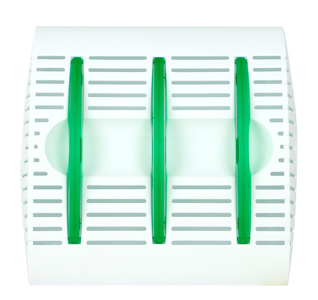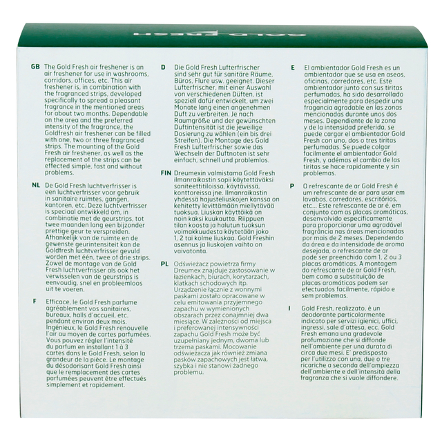 * De Gold Fresh is een luchtverfrisser voor gebruik in sanitaire ruimtes, gangen, kantoren, etc. Deze luchtverfrisser is speciaal ontwikkeld om, in combinatie met de geurstrips, tot twee maanden lang een bijzonder prettige geur te verspreiden. * Afhankelijk van de ruimte en de gewenste geurintensiteit kan de Gold Fresh luchtverfrisser gevuld worden met één, twee of drie strips. * Er zijn geen batterijen nodig. Zowel de montage van de Gold Fresh luchtverfrisser als ook het verwisselen van de geurstrips is eenvoudig en snel.