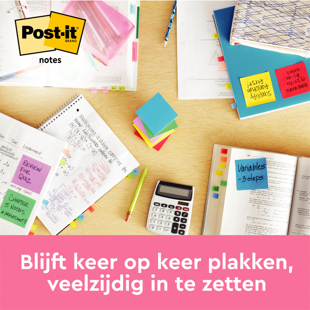 * Post-it® Super Sticky Notes hebben tweemaal zoveel kleefkracht (vergeleken met de originele Post-it® Notes). Ze zijn bijzonder sterk en uiterst veelzijdig en verkrijgbaar in verschillende zachte, felle of levendige kleuren die elke informatie of bericht laten opvallen. * Hechten steviger en gaan langer mee, met tweemaal zoveel kleefkracht als de originele Post-it® Notes. * Voeg wat kleur toe aan je berichten en laat de zon voor iemand schijnen. * Post-it® Super Sticky Notes zijn gemaakt van papiervezels met PEFC-certificering, afkomstig uit duurzaam beheerde bossen en gecontroleerde bronnen (PEFC 15-31-0134). * Ze zijn perfect voor verticale oppervlakken of oppervlakken die slecht hechten, zoals computerschermen, deuren en muren. Gemaakt met een lijm die voor 60% is gebaseerd op een hernieuwbare natuurlijke bron, een plant die jaarlijks weer aangroeit. * De verpakking van gerecycleerd karton kan worden gebruikt om je sticky notes makkelijk op te slaan en kan worden gerecycleerd zodra je die niet meer nodig hebt. * Download de gratis Post-it® App om notities direct vast te leggen en op te slaan, zodat je ze snel kunt delen met je team en niet eerst een verslag moet maken. * 76 mm x 76 mm, 90 Vellen/Blok, 5 Blokken/Verpakking.